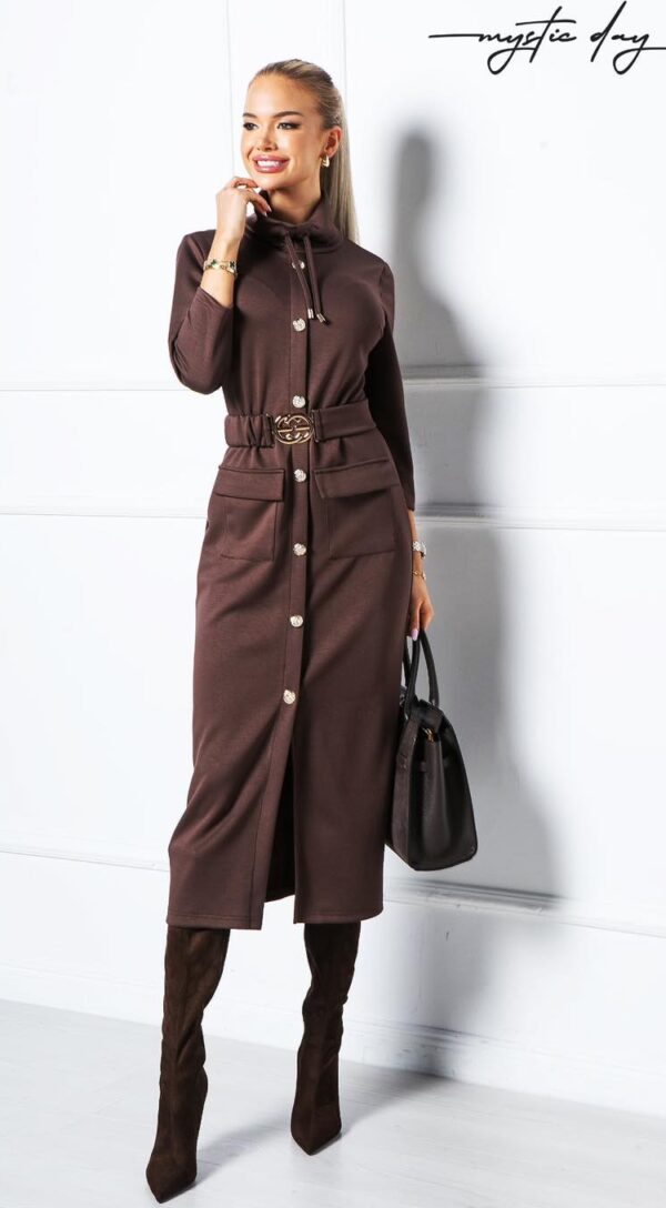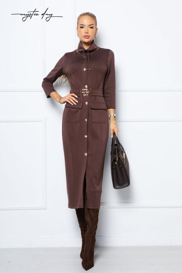 Az elöl található díszgombok finoman feldobják a ruhát, mégis megőrzik annak visszafogott eleganciáját. Könnyed anyaga és nőies szabása miatt tökéletes választás mindennapi viseletre, de elegáns kiegészítőkkel kiegészítve akár munkahelyi vagy alkalmi összeállítás része is lehet.