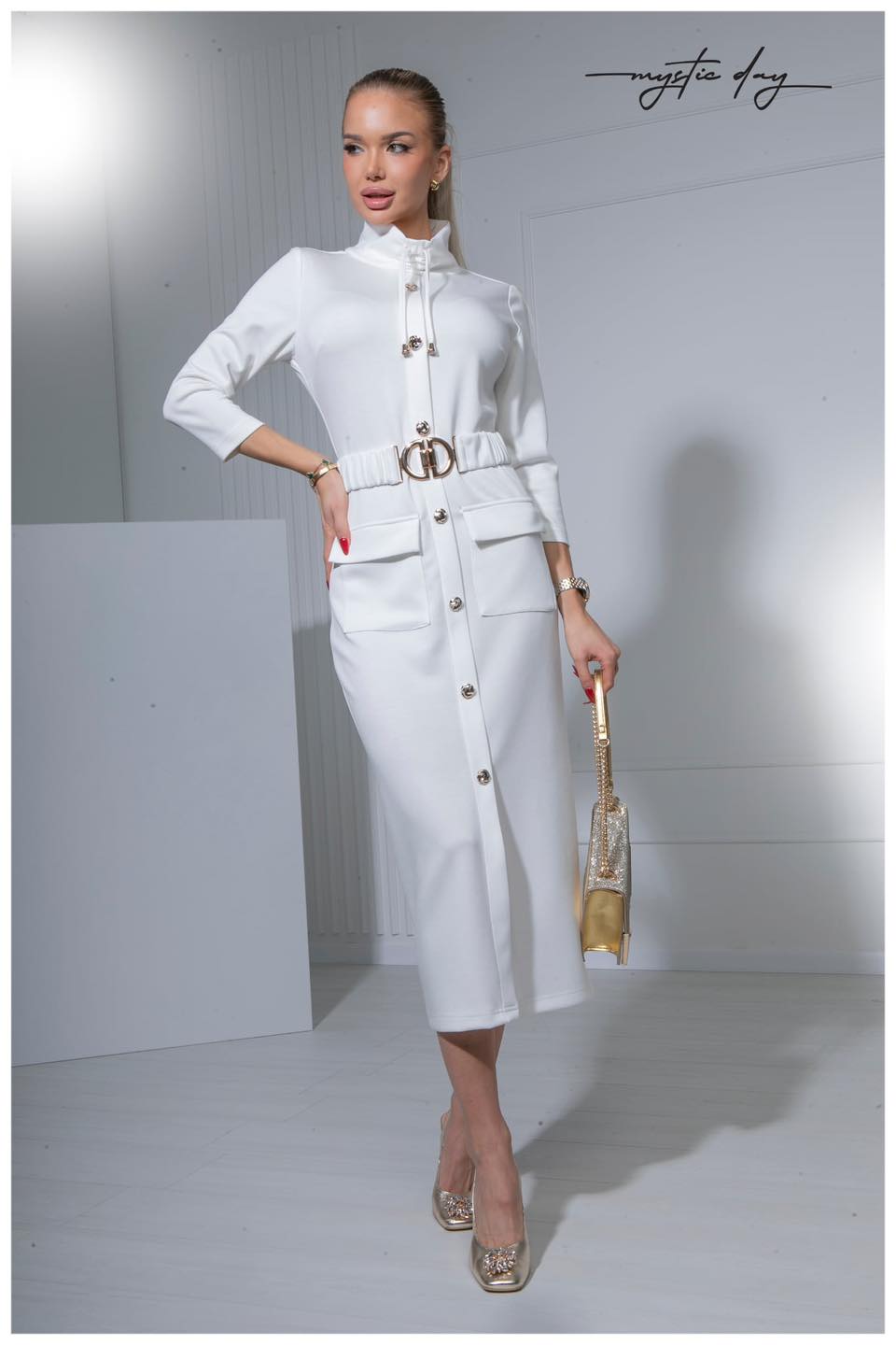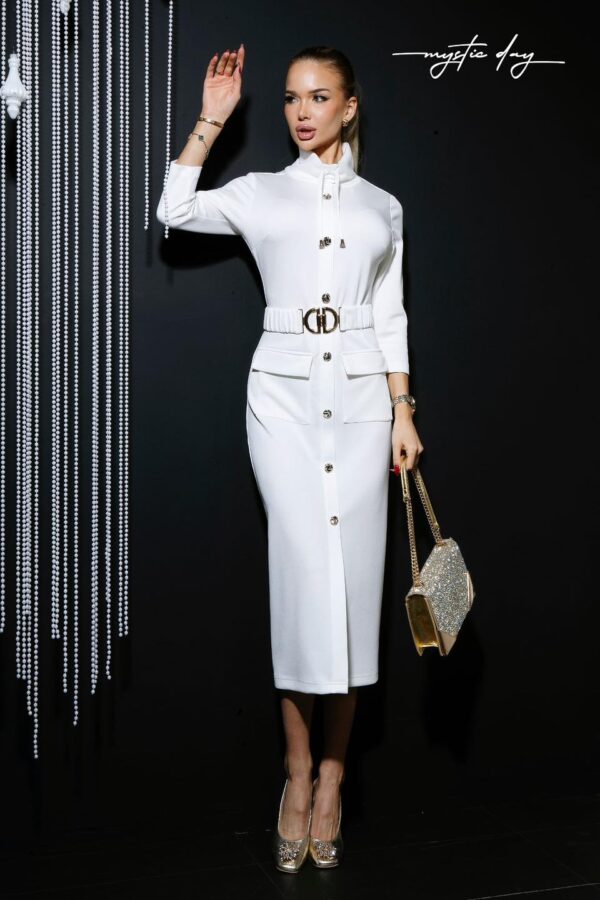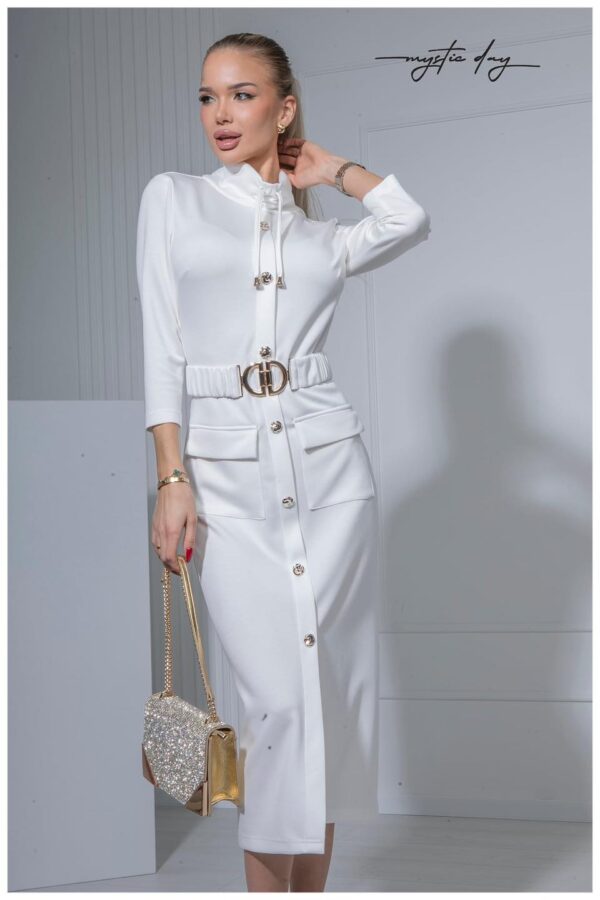 Az elöl található díszgombok finoman feldobják a ruhát, mégis megőrzik annak visszafogott eleganciáját. Könnyed anyaga és nőies szabása miatt tökéletes választás mindennapi viseletre, de elegáns kiegészítőkkel kiegészítve akár munkahelyi vagy alkalmi összeállítás része is lehet.