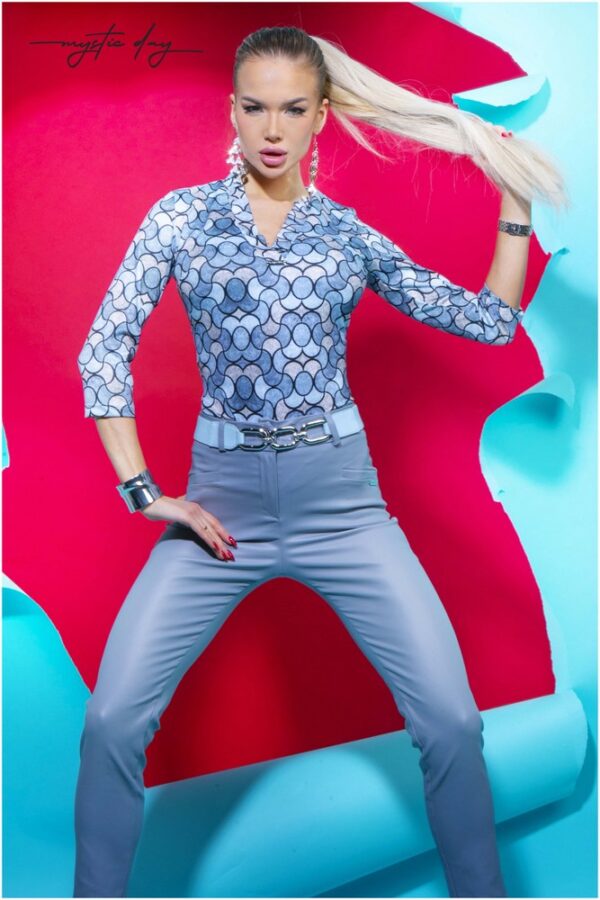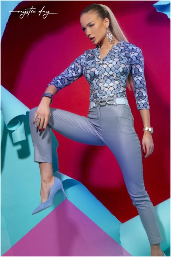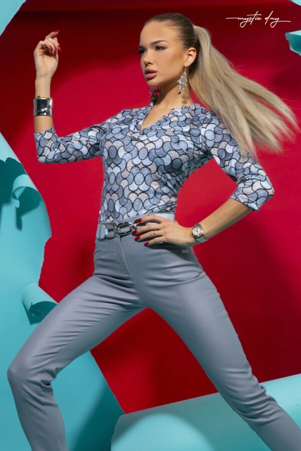 A Denisa kék-drapp mintás felső tökéletes választás, ha kényelmes, de mégis stílusos ruhadarabra van szükséged. A puha, elasztikus anyag és a háromnegyedes ujjú dizájn mindent megad, amire a mindennapi viselet során szükséged van. A mintás felső friss, nőies megjelenést biztosít, miközben a V-nyakú kialakítás kiemeli a dekoltázst és elegáns hatást kelt.