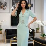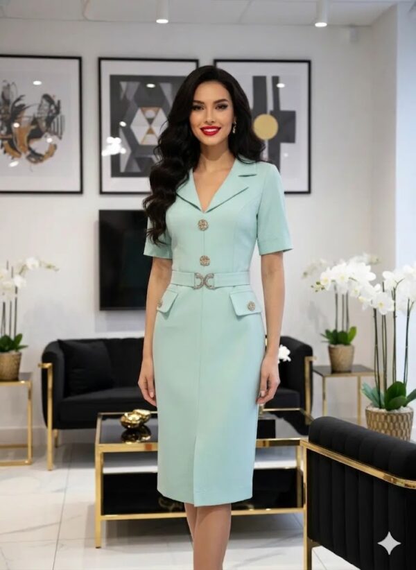 A Diamond ruha egy igazán elegáns darab, amely minden nő gardróbjában megállja a helyét. A rövid ujj kifinomult és kényelmes viseletet nyújt, így tökéletes választás akár munkahelyi megjelenéshez, akár alkalmi eseményekre. A galléros kialakítás és a dísz gombok különleges, luxus hatású részletek, amelyek egyedivé teszik a ruhát.