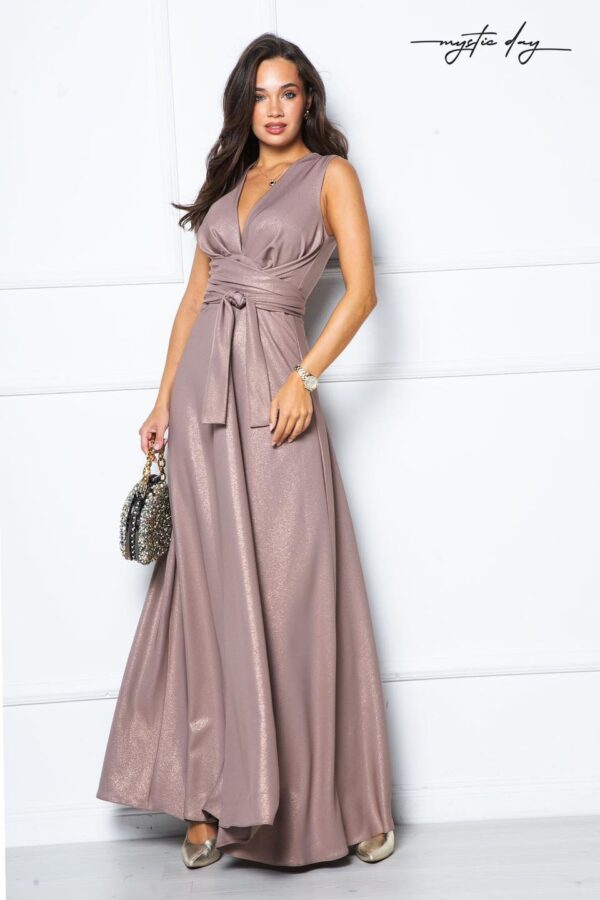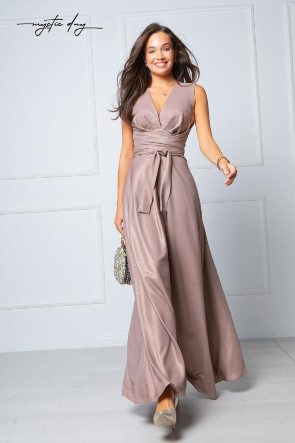 A ruha hátul cipzárral záródik, így kényelmes és praktikus viseletet biztosít. A derekán található megkötő szalag karcsúsítja a sziluettet, és egyedivé teszi a megjelenést. A padlóig érő maxi hossz igazi eleganciát sugall, így ideális választás esküvőre, bálra vagy különleges esti programokra.