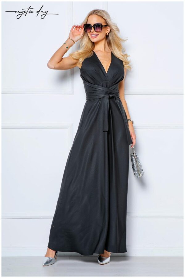 A ruha hátul cipzárral záródik, így kényelmes és praktikus viseletet biztosít. A derekán található megkötő szalag karcsúsítja a sziluettet, és egyedivé teszi a megjelenést. A padlóig érő maxi hossz igazi eleganciát sugall, így ideális választás esküvőre, bálra vagy különleges esti programokra.