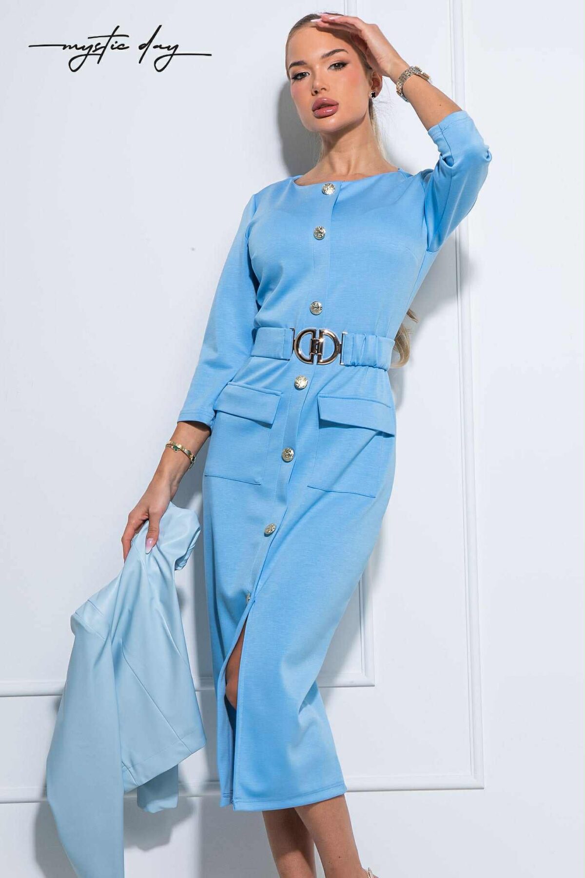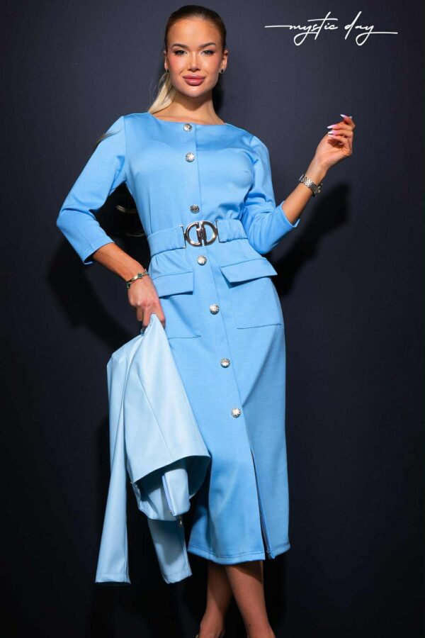 A díszgombok és a díszzsebek különleges karaktert adnak a ruhának, a hozzá tartozó gumis öv pedig szépen kiemeli a derekat, optikailag karcsúsítva az alakot. A 3/4-es ujjak és a kerek nyakkivágás kényelmes, mégis elegáns megoldást nyújtanak, így a ruha tökéletes választás munkába, városi programokra vagy akár egy stílusos vacsorára is.