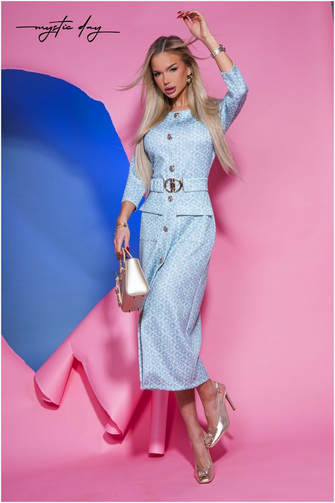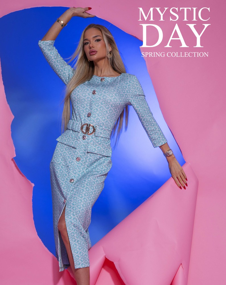 A Mystic Day Fanni mintás midi ruha a nőies elegancia és a hétköznapi kényelem tökéletes egyensúlyát kínálja. A midi hossz és az elöl sliccelt kialakítás harmonikusan ötvözi az eleganciát a praktikus viselettel, miközben a mintás anyag friss és divatos megjelenést biztosít.