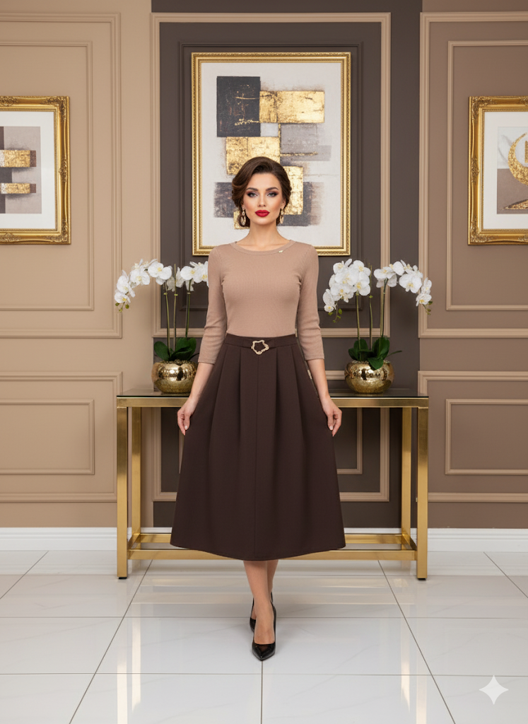 Vásárolok →A Frézia drapp–csokibarna ruha egy stílusos és nőies darab, amely a mindennapokban és különleges alkalmakon is tökéletes választás. A felső rész finom drapp színe és kötött anyaga puhaságot és kényelmet ad, míg a csokibarna szoknyarész elegáns kontrasztot teremt.