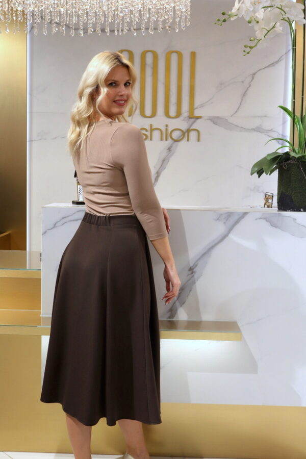 A Frézia drapp–csokibarna ruha egy stílusos és nőies darab, amely a mindennapokban és különleges alkalmakon is tökéletes választás. A felső rész finom drapp színe és kötött anyaga puhaságot és kényelmet ad, míg a csokibarna szoknyarész elegáns kontrasztot teremt.