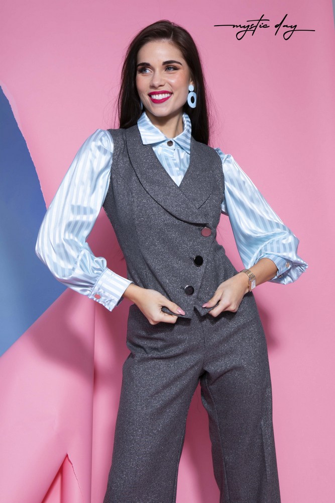 A Fruzsina mellény igazi alapdarab, amely számtalan módon kombinálható. A V nyakú kialakítás egyszerű és letisztult, így elegáns megjelenést biztosít. Az arany gombok különleges, luxus hatást kölcsönöznek, amelyek azonnal feldobják a megjelenést.