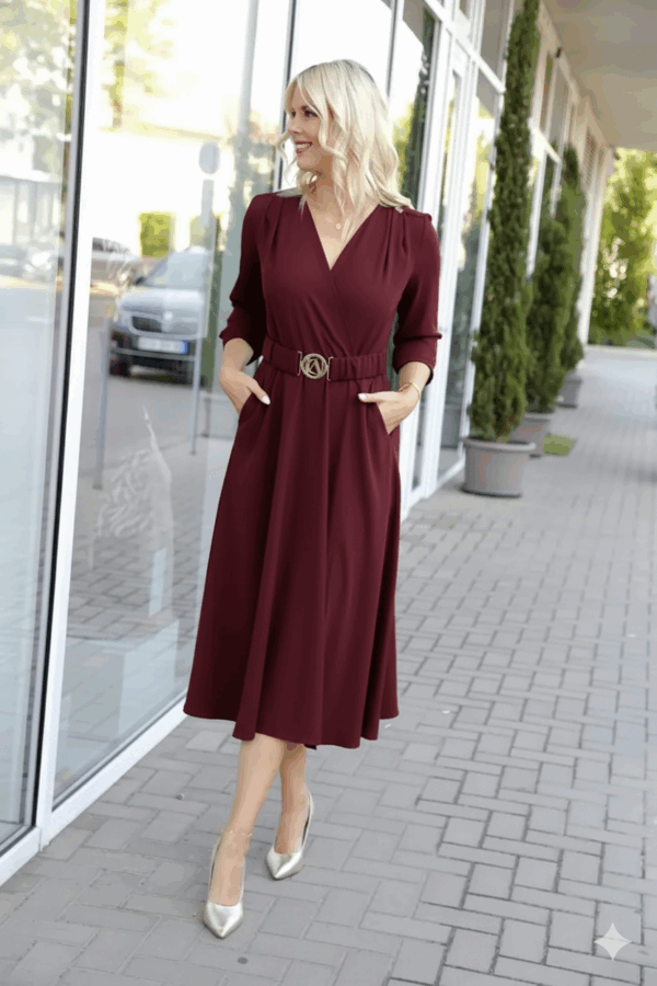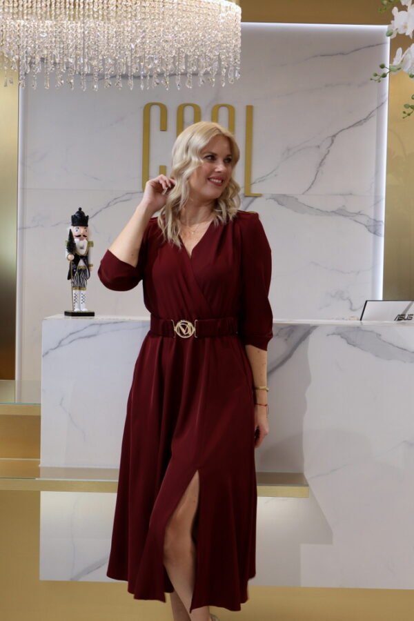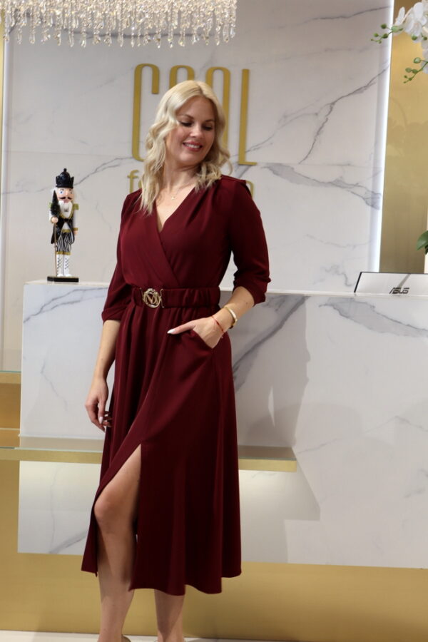 A Mystic Day – Gréti bordó midi ruha egy igazán nőies és elegáns választás, amely tökéletesen kihangsúlyozza az alakot. A lágyan átlapolt mellrész és a derékrésznél szabott fazon kiemeli a nőies vonalakat, míg a háromnegyedes ujj és a midi hossz letisztult, kifinomult megjelenést biztosít.