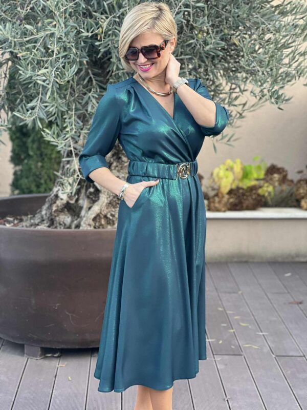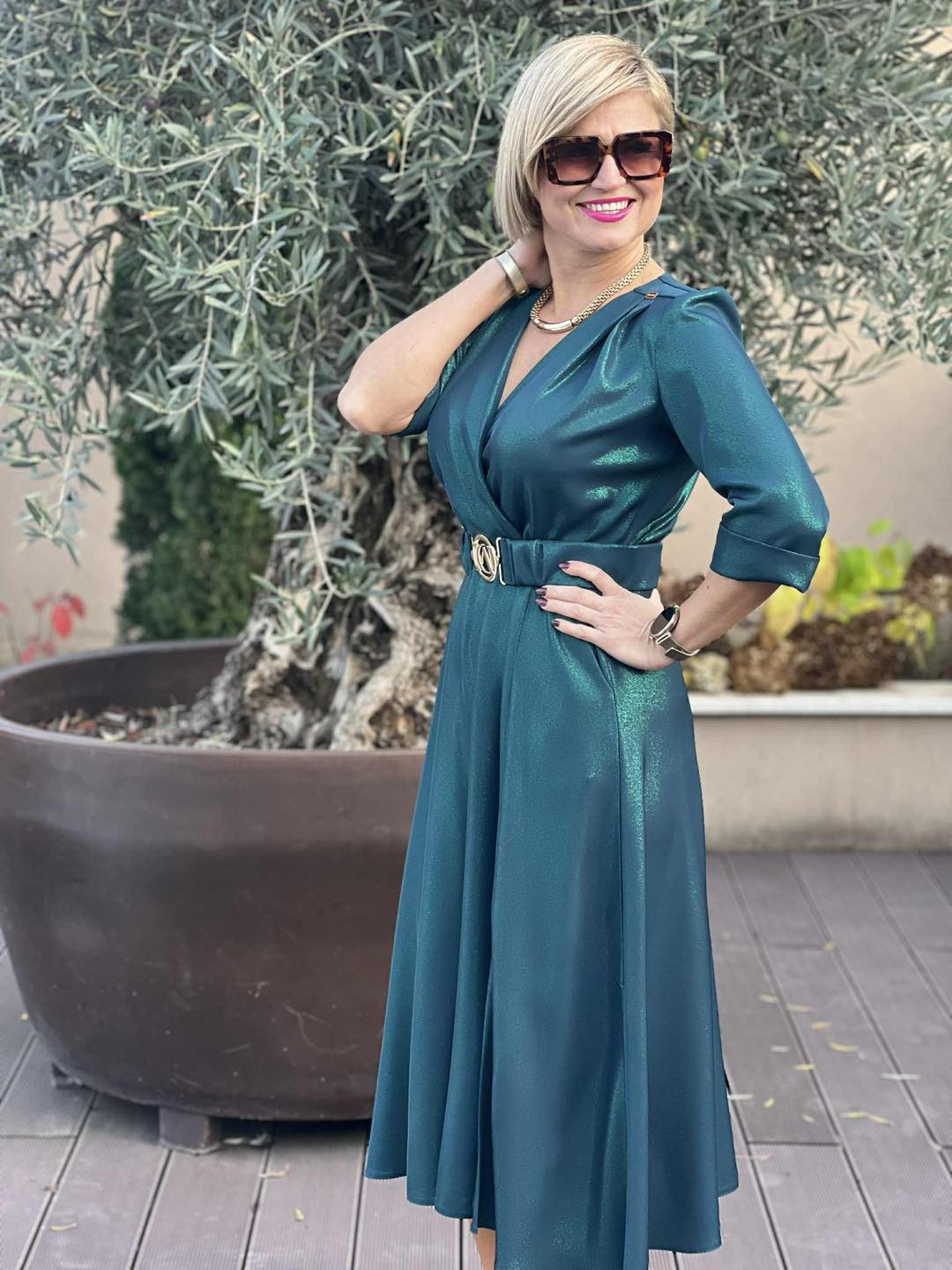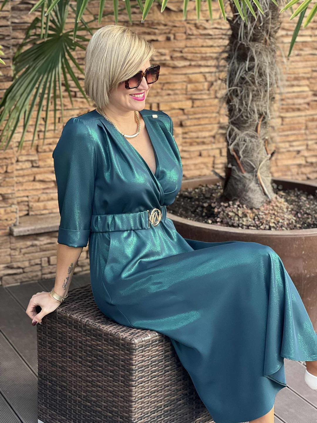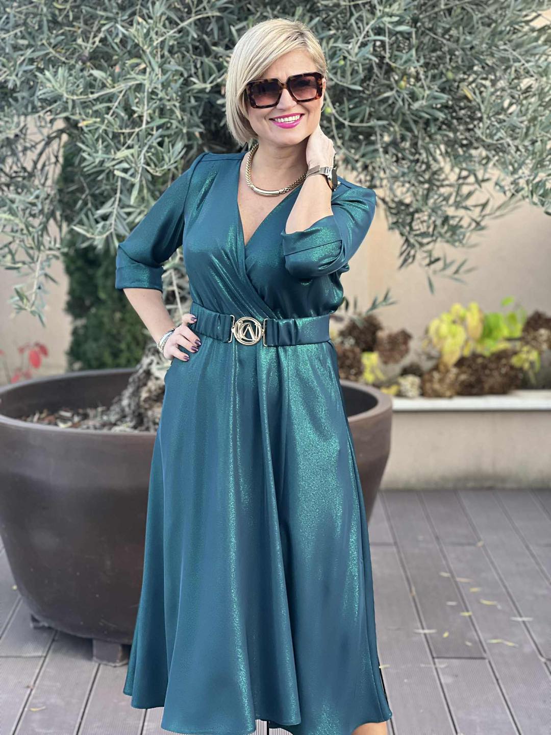 A Mystic Day – Gréti smaragd midi ruha egy igazán nőies és elegáns választás, amely tökéletesen kihangsúlyozza az alakot. A lágyan átlapolt mellrész és a derékrésznél szabott fazon kiemeli a nőies vonalakat, míg a háromnegyedes ujj és a midi hossz letisztult, kifinomult megjelenést biztosít.