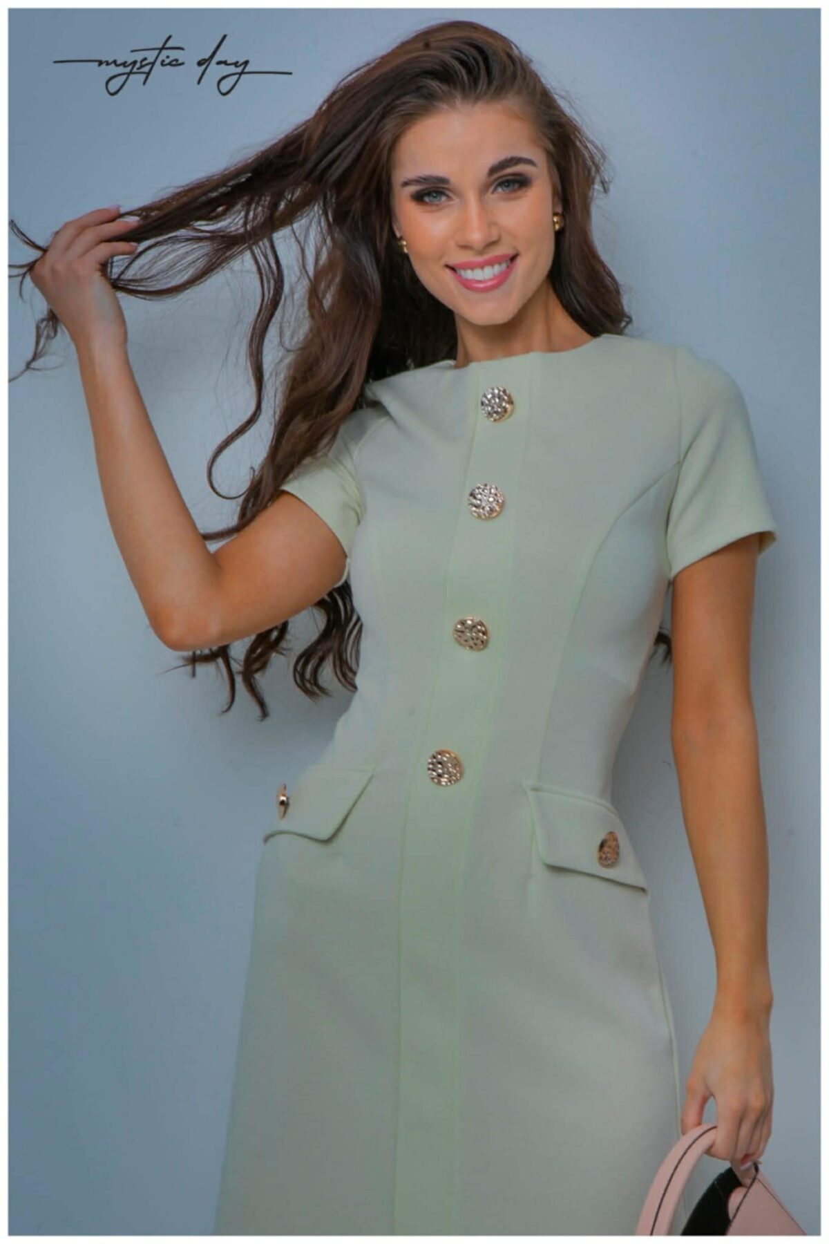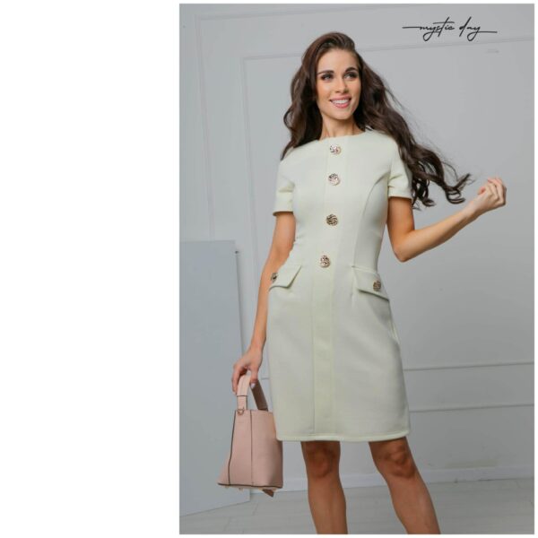 Az elöl végigfutó díszgombok és a zsebfedők arany részletei luxus hatást keltenek, így a ruha önmagában is statement darab. Tökéletes választás üzleti megjelenéshez, alkalmi eseményekre, családi ünnepekre vagy akár elegáns hétköznapokra is. Egy magassarkúval és egy karakteres clutch-csal kombinálva igazán sikkes, nőies összhatást érhetsz el.