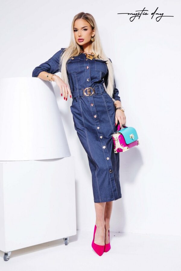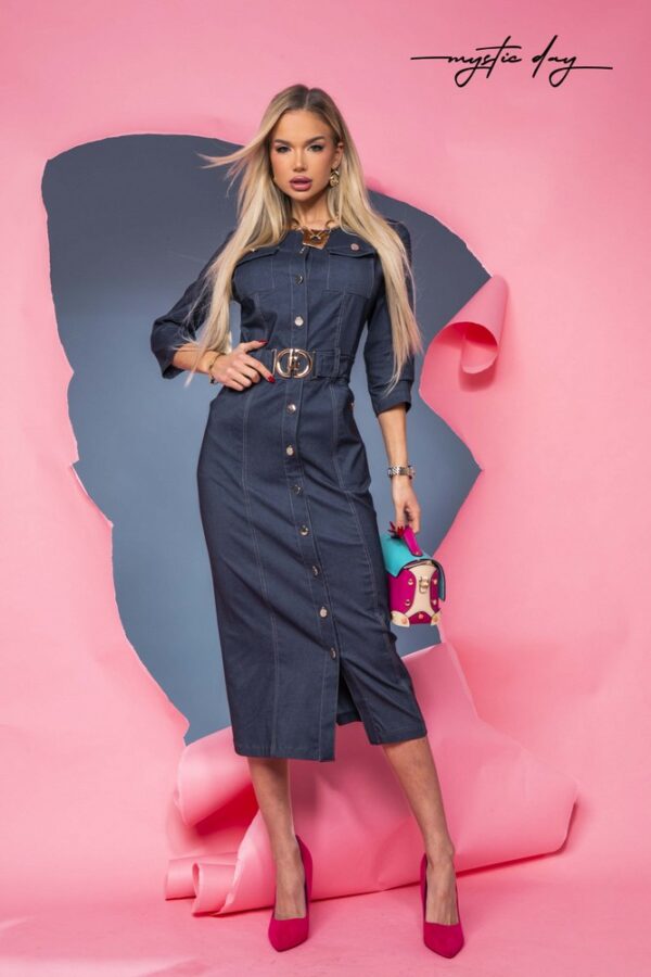 A Mystic Day Lara farmerkék gombos midi ruha tökéletes választás azoknak, akik szeretik az elegáns, mégis hétköznapokon is jól hordható darabokat. A midi hossz és a ceruza fazon gyönyörűen kiemeli a nőies alakot, miközben a testhezálló szabás és a derékban kialakított szabásvonal karcsú sziluettet ad.