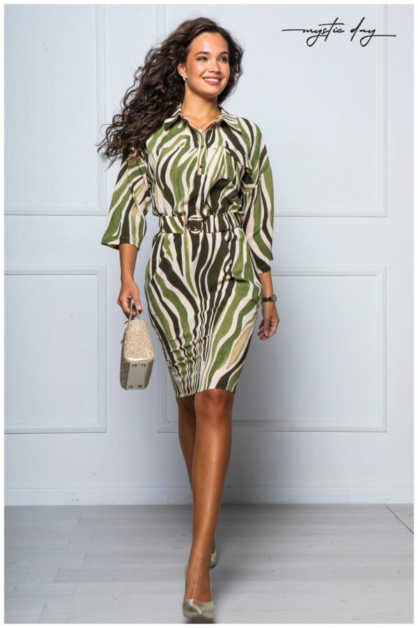 A Lilirózsa zöld hullám mintás ruha elegáns és kényelmes választás mindennapi vagy alkalmi viseletre. A harmonikus színvilág és a finom mintázat kifinomult megjelenést kölcsönöz, miközben a zsebes mellrész és a galléros kialakítás praktikus és stílusos részletekkel gazdagítja a darabot. A midi hossz időtálló eleganciát sugall, az öv pedig hangsúlyozza a derékvonalat, kiemelve az alakot.