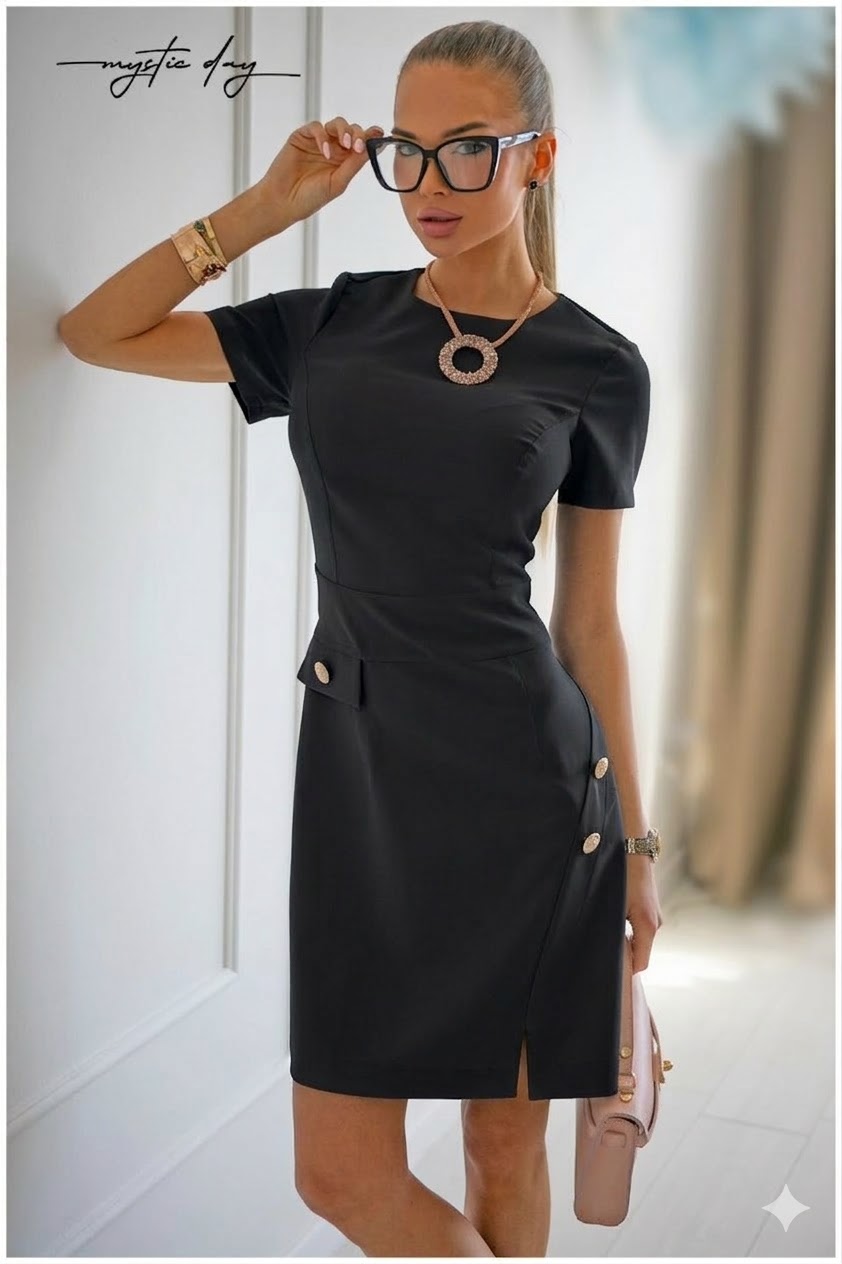 Ha egy olyan ruhát keresel, ami egyszerre letisztult, nőies és kényelmes, ez a darab gyorsan a kedvenced lesz. Kerek nyakával és rövid ujjával időtálló alap, a derékban szabott vonal pedig finoman hangsúlyozza az alakot. Irodai napokra, üzleti meetingre, randira vagy egy elegánsabb hétköznapi programra is remek választás—csak a kiegészítőket variáld, és máris más hangulatot kap.