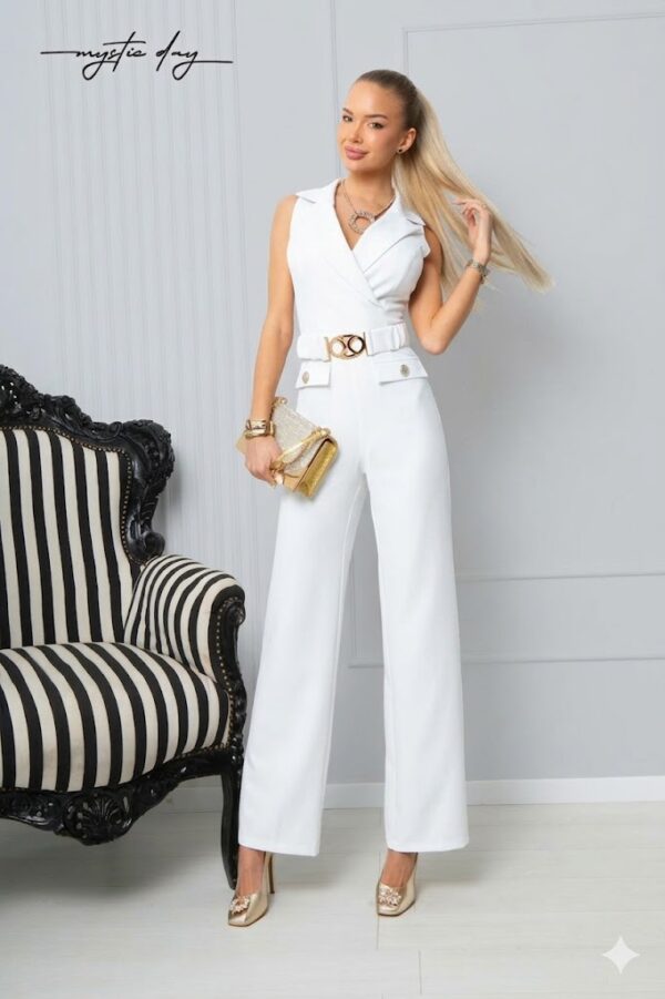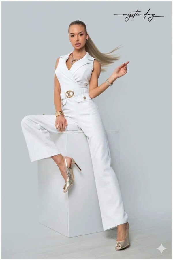 A Liza galléros overál igazi stílusos alapdarab a modern, magabiztos nők számára. Nőiességet sugároz, így tökéletes választás különleges alkalmakra, vacsorákra vagy elegáns rendezvényekre. A galléros, V-kivágású mellrész átlapolt szabásával szépen formálja a felsőtestet, míg a díszgombokkal ellátott dísz zsebrész elegáns részletként kiemeli a nőies sziluettet.