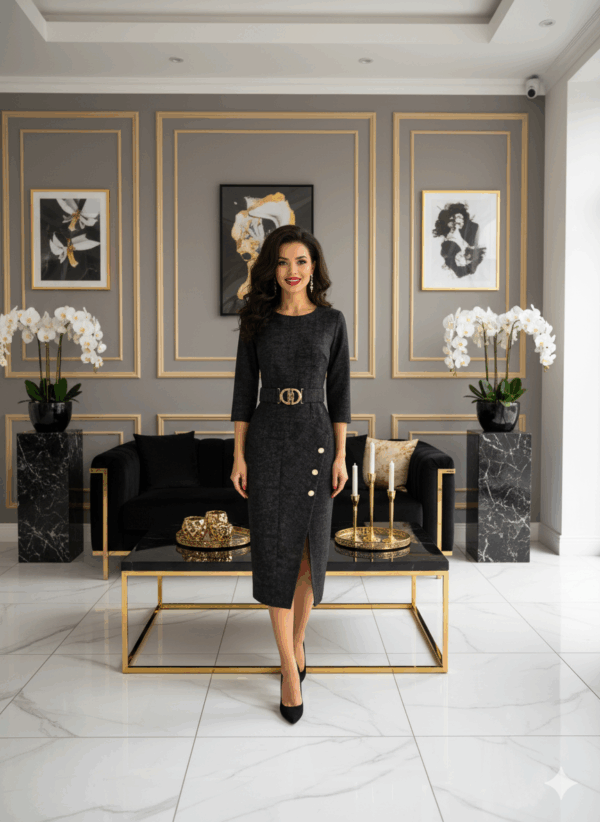 A Marbella háromnegyedes ujjú ruha tökéletes választás azoknak a nőknek, akik szeretik az eleganciát és a nőies részleteket. A kereknyakú fazon letisztultságot sugároz, míg az oldalsó arany gombdíszítés és a fémcsatos öv modern, luxus hatást kölcsönöz az összképnek.