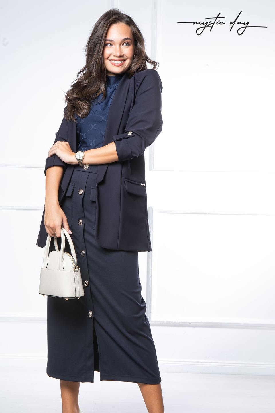 A Marietta sötétkék midi szoknya elegáns, kifinomult darab, amely tökéletes választás munkába, alkalmakra vagy akár hétköznapi elegáns szettekhez. A sötétkék árnyalat időtálló és könnyen kombinálható, míg az arany gombok exkluzív, nőies ragyogást adnak a szoknyának.