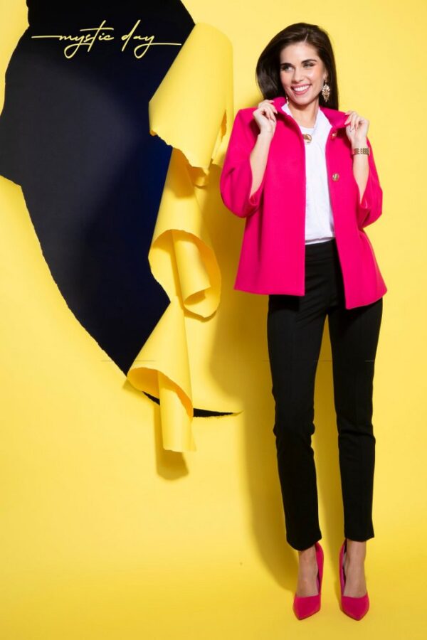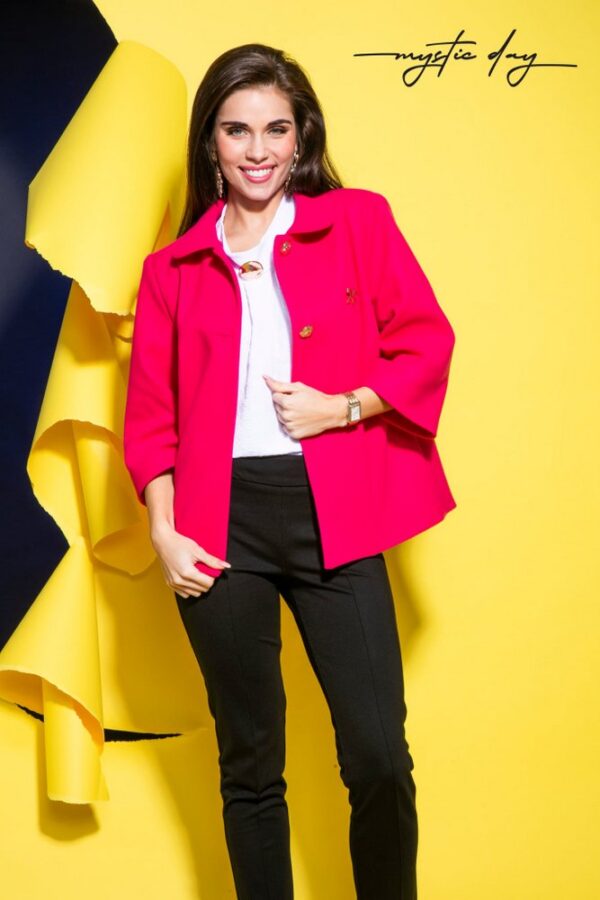 A klasszikus galléros kialakítás és az arany gombok igazán kifinomult, exkluzív hatást keltenek, amely feldobja még az egyszerűbb szetteket is. Tökéletesen passzol ruhákhoz, szoknyákhoz és elegáns nadrágokhoz egyaránt – legyen szó munkáról, városi sétáról vagy egy különlegesebb alkalomról.