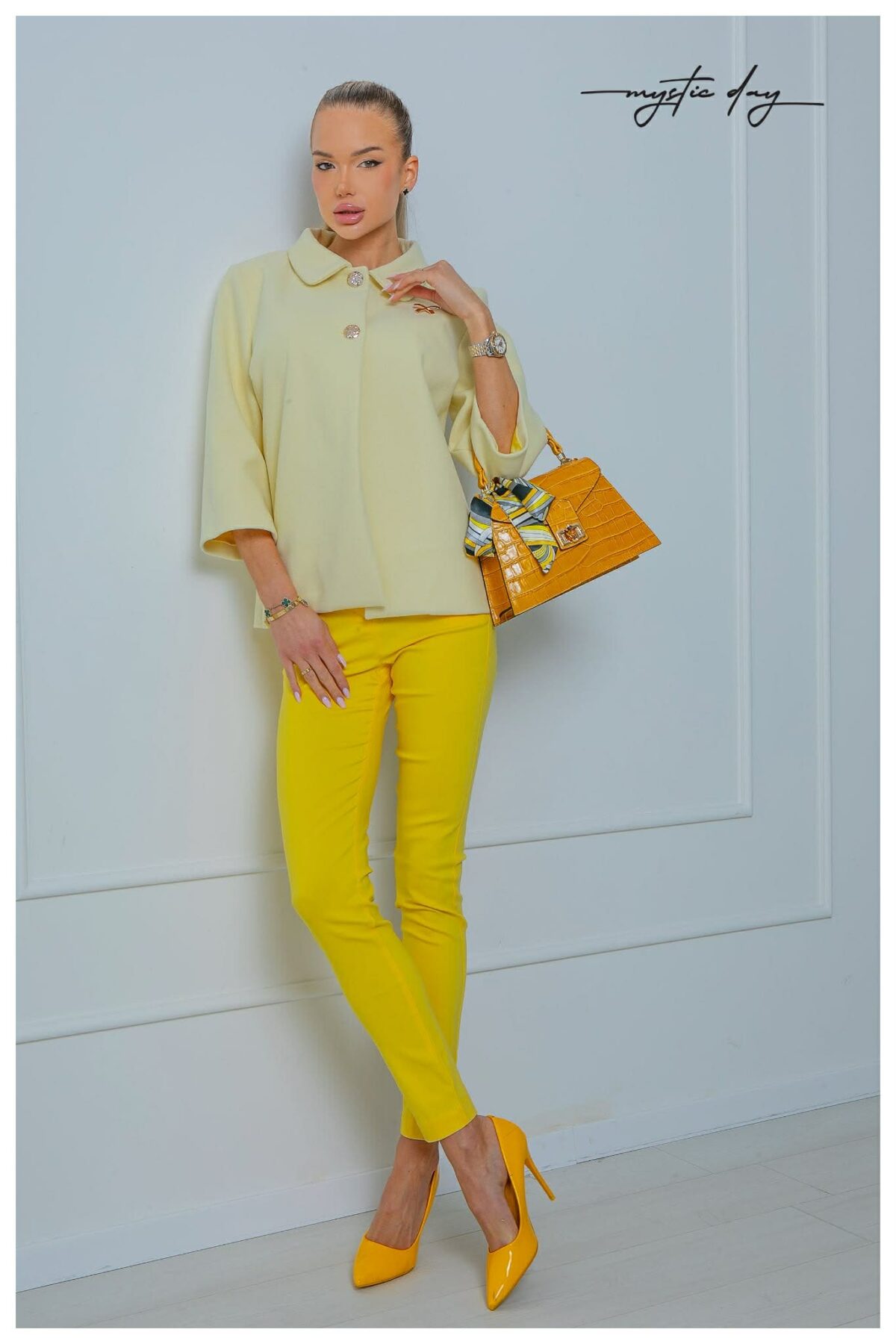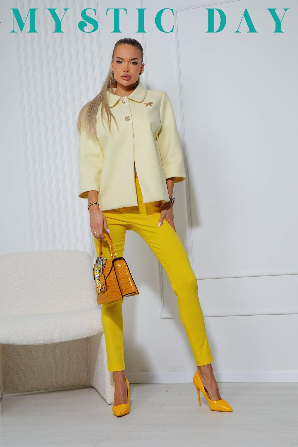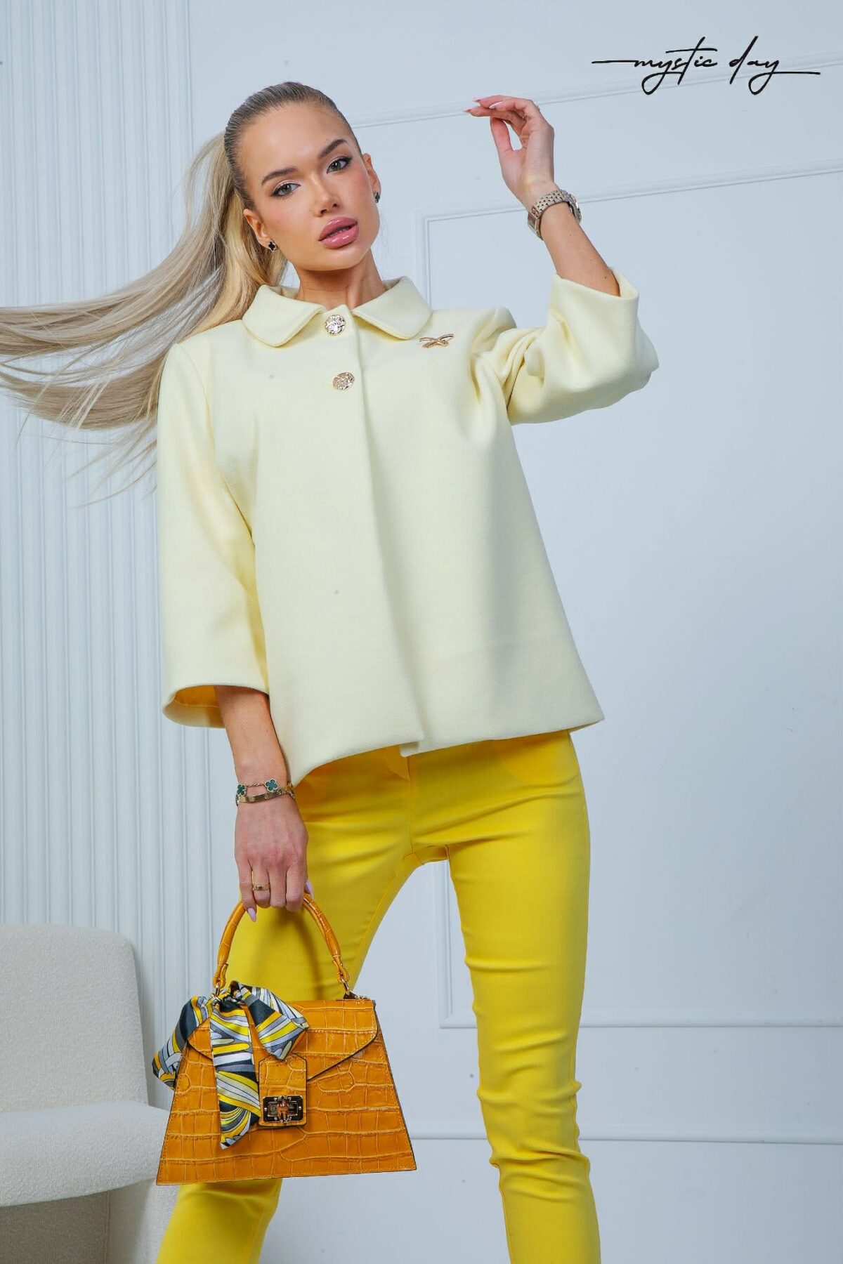 A Mystic Day Masni szövet kiskabát a letisztult elegancia és a nőies részletek tökéletes kombinációja. A szövet anyag tartást ad a kabátnak, miközben kényelmes viselet marad a hűvösebb napokon. A 3/4-es ujjhossz könnyed megjelenést biztosít, így ideális választás tavaszi, őszi időszakra vagy akár enyhébb nyári estékre is.