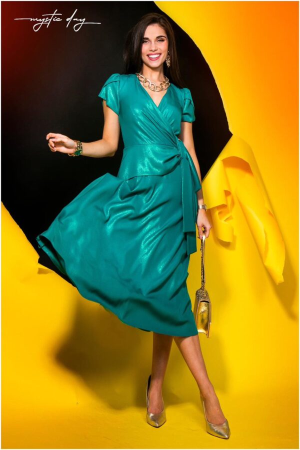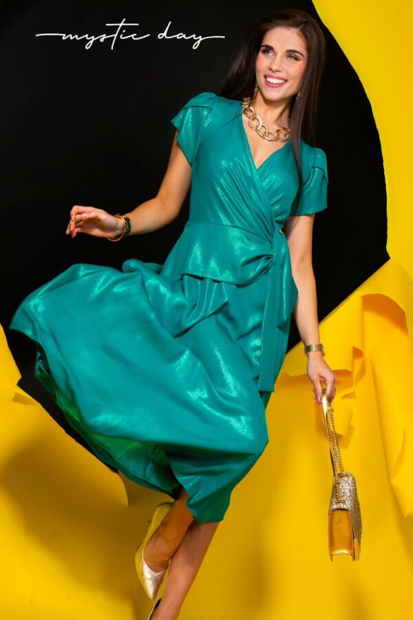 A Milánó smaragdzöld csillogós ruha igazi ékszerdarab az alkalmi ruhák között. Gazdag, smaragdzöld színe és finom csillogása eleganciát és kifinomultságot sugároz, miközben az átlapolt mellrész és a V nyakkivágás gyönyörűen kiemeli a nőies vonalakat.