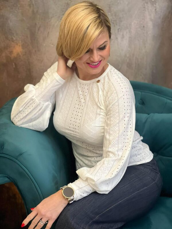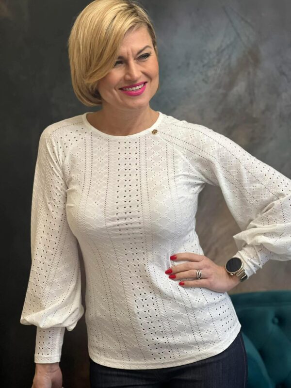 A Raglán lyukhímzéses buggyos ujjú felső igazi romantikus darab, amely finom részleteivel azonnal feldobja a megjelenésed. A lyukhímzéses anyag légies hatást kelt, miközben nőies és elegáns összhatást ad. A raglán ujjmegoldás kényelmes viseletet biztosít, a buggyos ujjak pedig különleges, trendi karaktert kölcsönöznek a felsőnek.