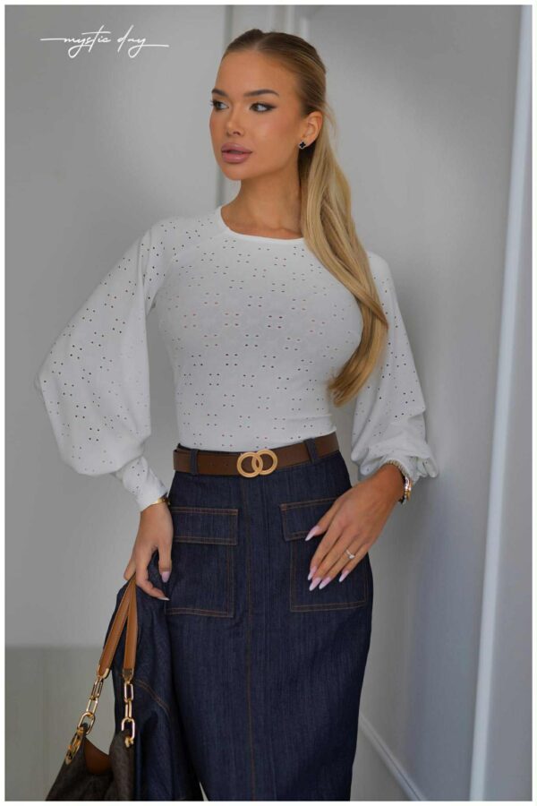 A Raglán lyukhímzéses buggyos ujjú felső igazi romantikus darab, amely finom részleteivel azonnal feldobja a megjelenésed. A lyukhímzéses anyag légies hatást kelt, miközben nőies és elegáns összhatást ad. A raglán ujjmegoldás kényelmes viseletet biztosít, a buggyos ujjak pedig különleges, trendi karaktert kölcsönöznek a felsőnek.