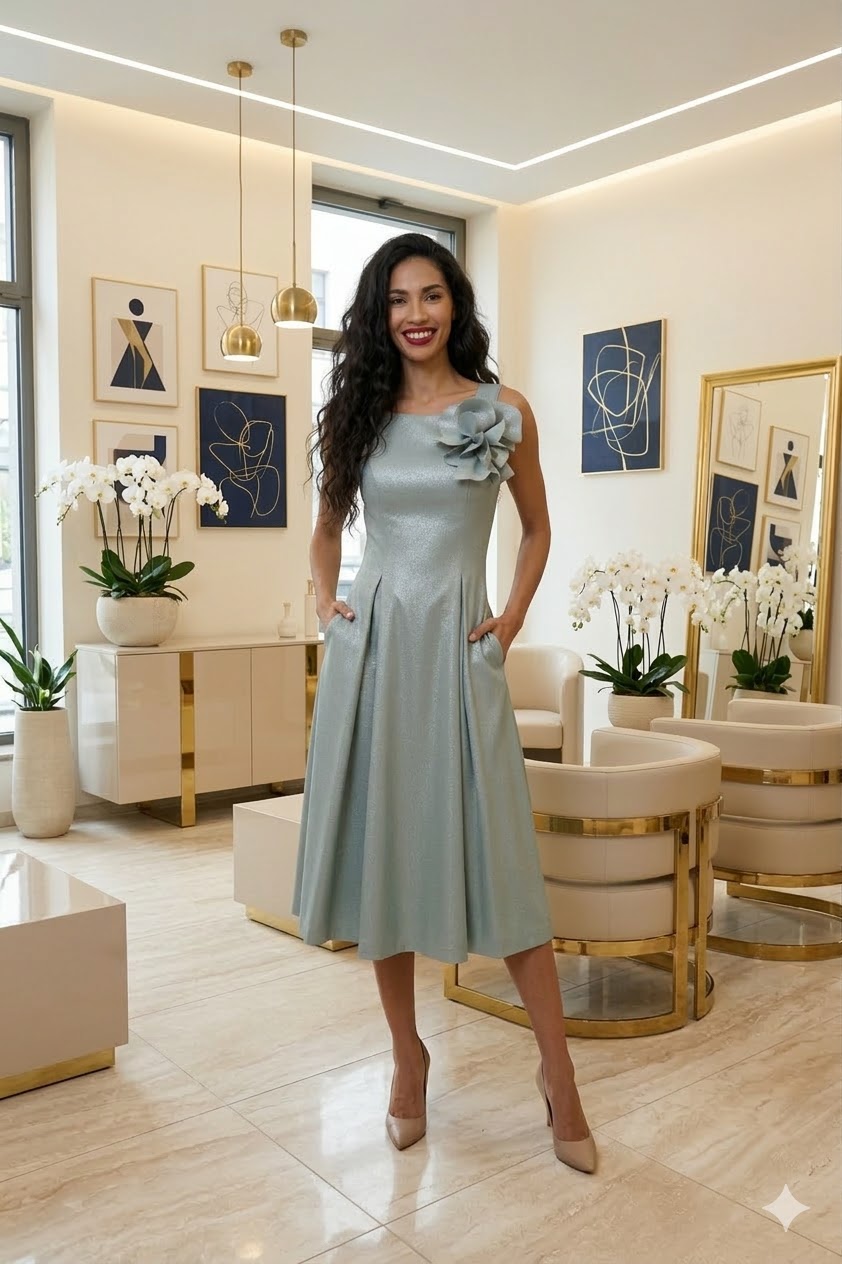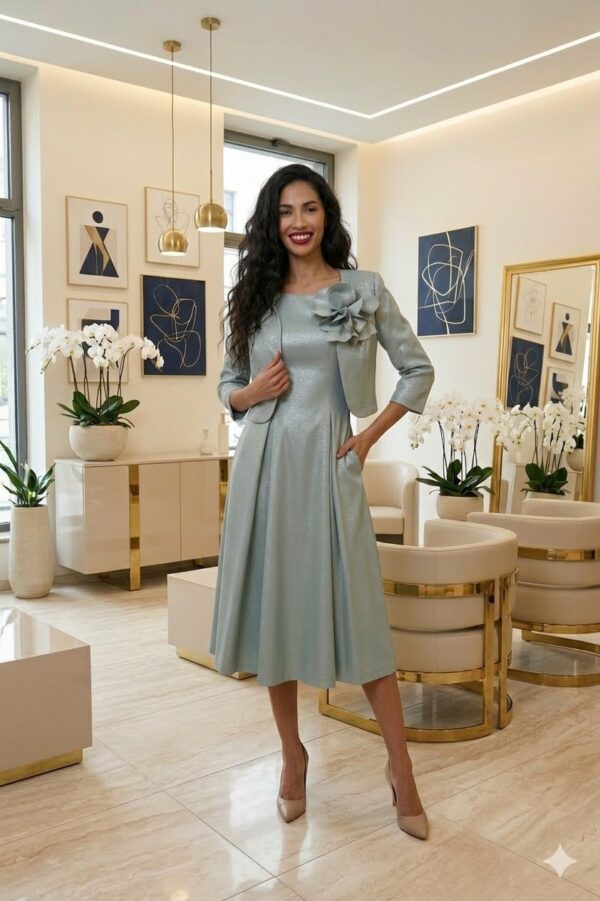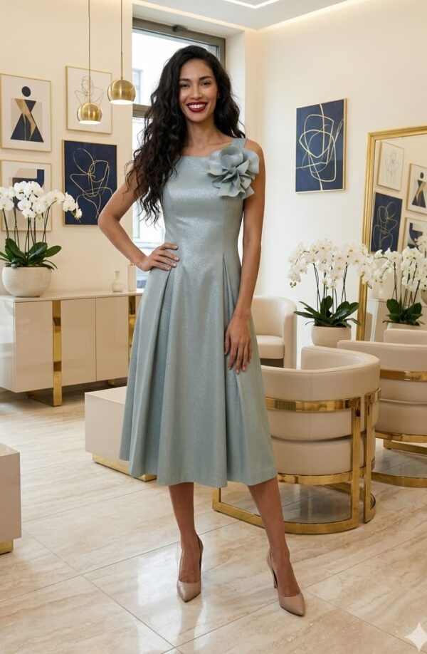 A ujjatlan kialakítás és a lágy menta árnyalat időtlen eleganciát sugároz, amely minden testalkathoz remekül illeszkedik. A ruha tartozéka egy stílusos rózsabross, amely még különlegesebbé teszi ezt a csodás darabot.