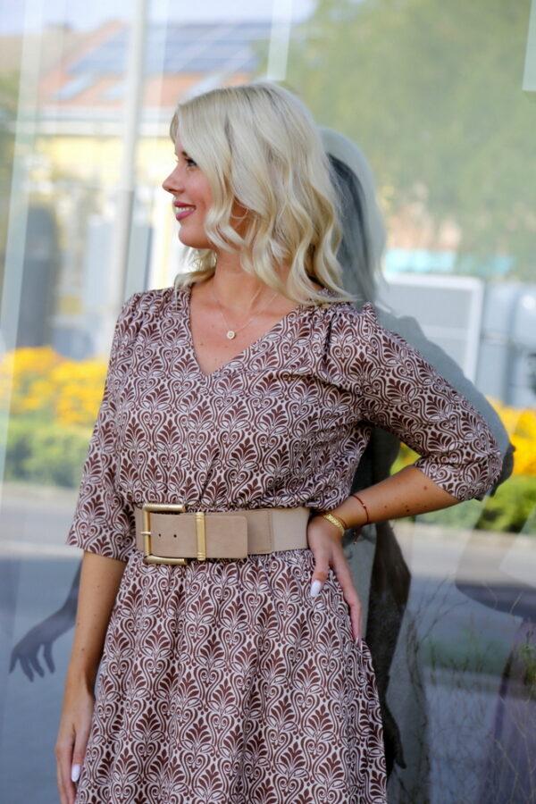 A Tamara barna mintás ruha tökéletes darab, ha a kényelem mellett az elegáns megjelenés is fontos számodra. A V kivágott nyakkivágás nőies és előnyös, szépen kiemeli a dekoltázst, míg a háromnegyedes ujjak eleganciát sugallnak, és ideálisak az átmeneti évszakokra.