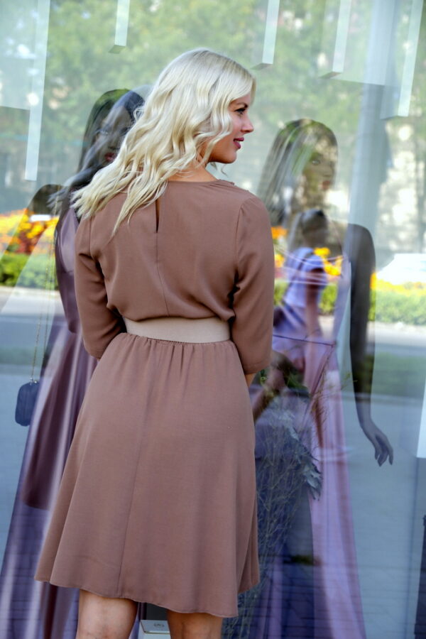 A Tamara caramel ruha tökéletes darab, ha a kényelem mellett az elegáns megjelenés is fontos számodra. A V kivágott nyakkivágás nőies és előnyös, szépen kiemeli a dekoltázst, míg a háromnegyedes ujjak eleganciát sugallnak, és ideálisak az átmeneti évszakokra.