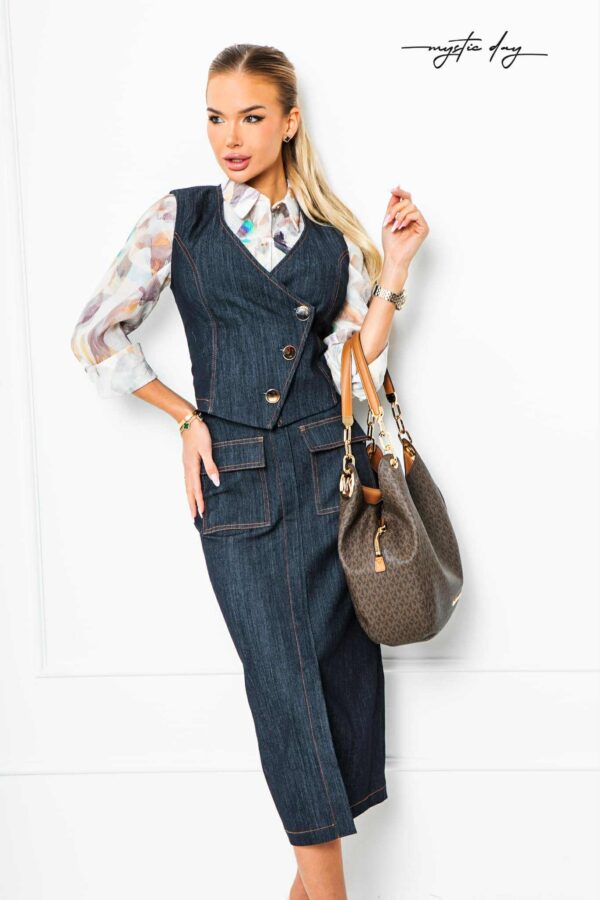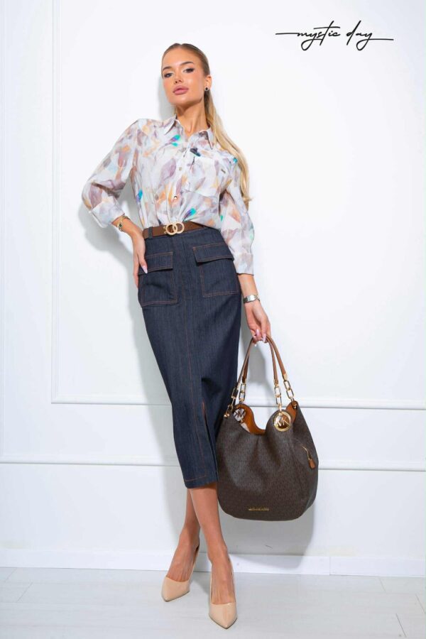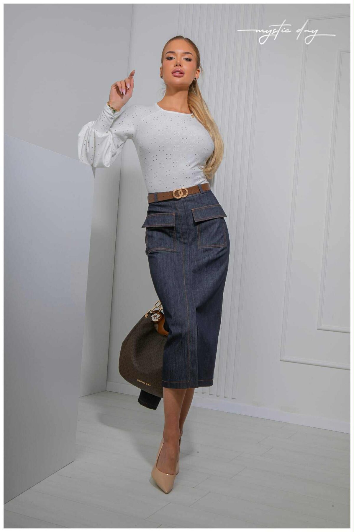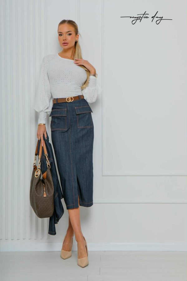 A dísz zsebek különleges részletként gazdagítják a szoknya megjelenését, az öv pedig – amely a szoknya tartozéka – szépen kiemeli a derekat, és segít a tökéletes sziluett kialakításában. Könnyedén kombinálható elegáns blúzzal, inggel vagy akár egy egyszerű felsővel is.