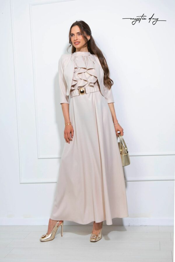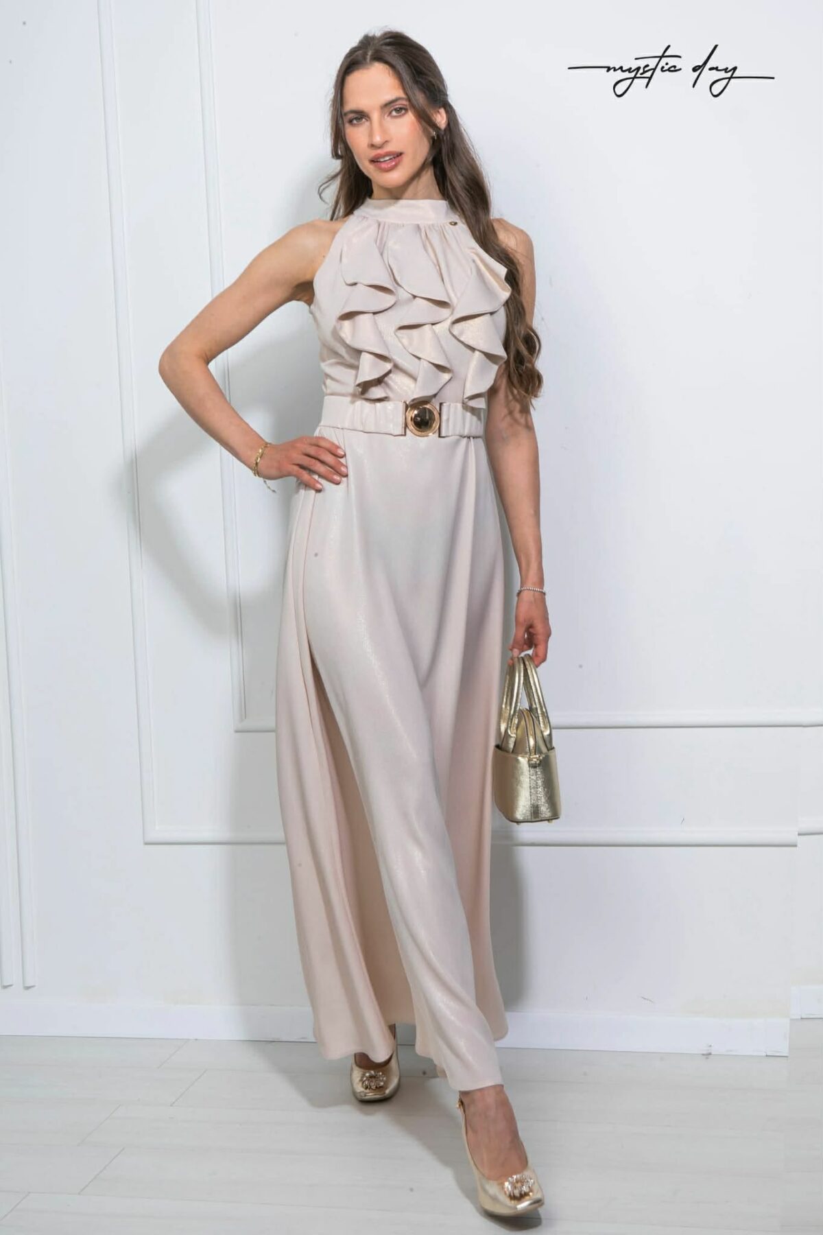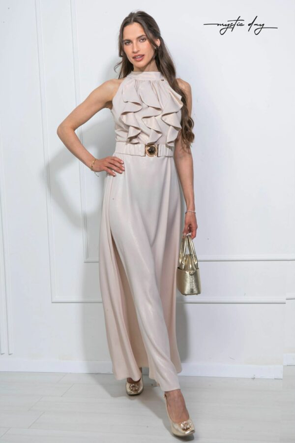 A ruha különleges megjelenését tovább fokozza a deréknál található öv, amely kiemeli az alakot, és harmonikus sziluettet kölcsönöz. A cipzáras hátrész gondoskodik a kényelmes és biztos illeszkedésről.
