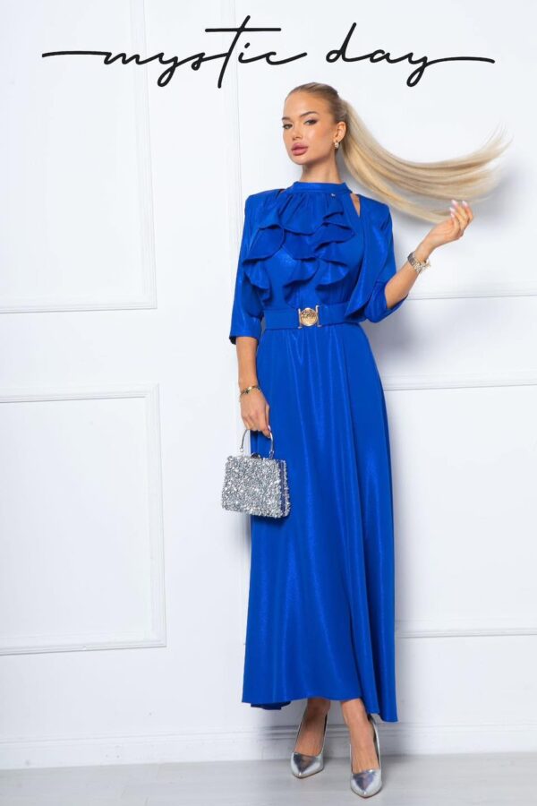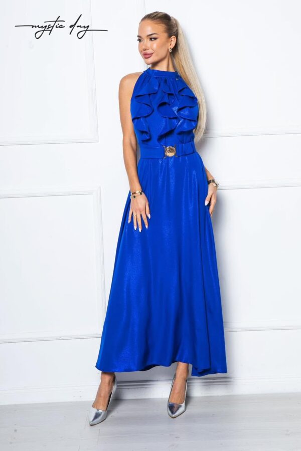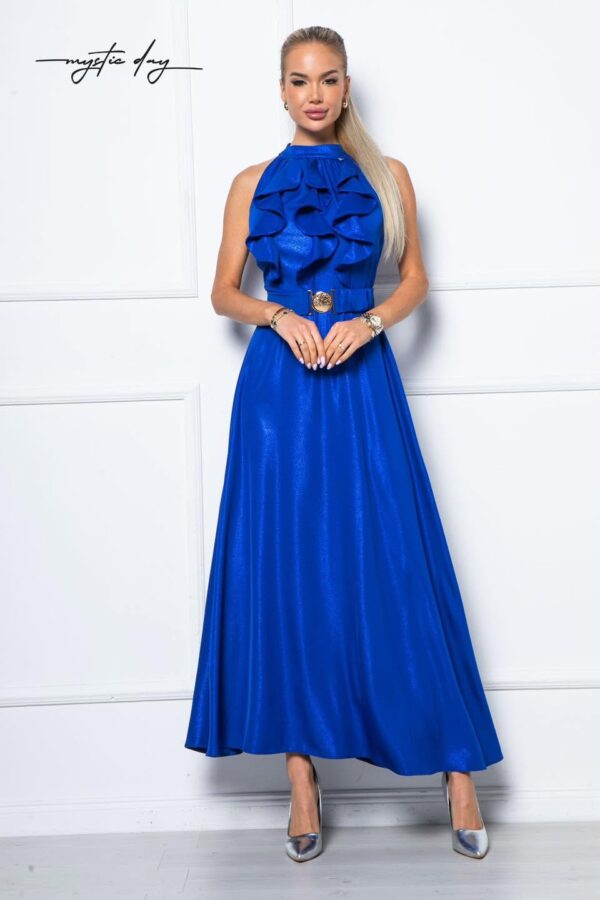 A ruha különleges megjelenését tovább fokozza a deréknál található öv, amely kiemeli az alakot, és harmonikus sziluettet kölcsönöz. A cipzáras hátrész gondoskodik a kényelmes és biztos illeszkedésről.