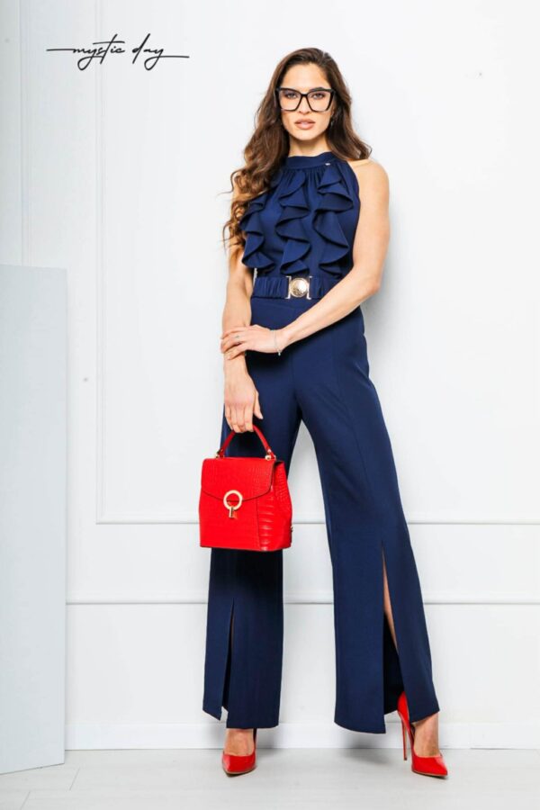 A Zsanett sötétkék zsabós overál a nőiesség és elegancia tökéletes kombinációja. A magas nyakú kialakítás eleganciát sugároz, míg az ujjatlan szabás modern és könnyed viseletet nyújt. Az elől zsabós mellrész romantikus és figyelemfelkeltő részlet, amely különlegessé teszi az egész megjelenést.