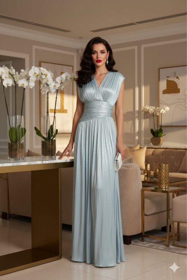 Ez a maxi ruha a letisztult elegancia és a nőies könnyedség tökéletes kombinációja. Az átlapolt V-nyak hangsúlyozza a felsőtestet, míg a derékban húzott kialakítás szépen formálja az alakot. A lenge, bő szoknyarész lágyan követi a mozgást, így minden lépésnél különleges, légies hatást kelt. Ideális választás nyári esküvőkre, alkalmi rendezvényekre, tengerparti vacsorákhoz vagy bármilyen eseményre, ahol egyszerre szeretnél elegáns és nőies lenni. Könnyed anyagának köszönhetően egész napos viseletként is kényelmes.