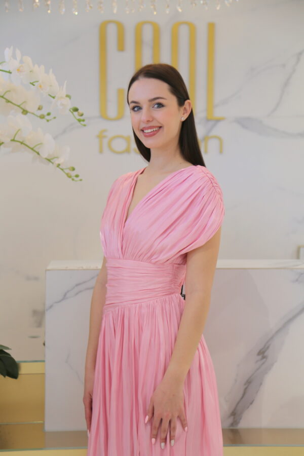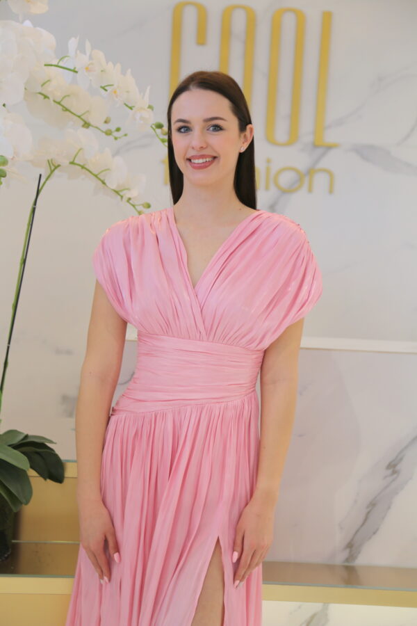 Ez a maxi ruha a letisztult elegancia és a nőies könnyedség tökéletes kombinációja. Az átlapolt V-nyak hangsúlyozza a felsőtestet, míg a derékban húzott kialakítás szépen formálja az alakot. A lenge, bő szoknyarész lágyan követi a mozgást, így minden lépésnél különleges, légies hatást kelt. Ideális választás nyári esküvőkre, alkalmi rendezvényekre, tengerparti vacsorákhoz vagy bármilyen eseményre, ahol egyszerre szeretnél elegáns és nőies lenni. Könnyed anyagának köszönhetően egész napos viseletként is kényelmes.