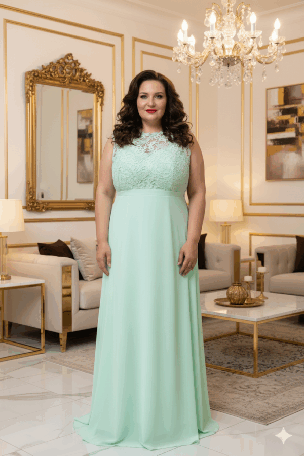 A nagyméretű menta muszlin maxi ruha tökéletes választás különleges alkalmakra, ha egyedi és kifinomult megjelenést keresel. A horgolt csipkével díszített, necc betétes mellrész romantikus és nőies hatást kelt, míg a gumis hátkialakítás és az elasztikus anyag biztosítja a kényelmes viseletet.