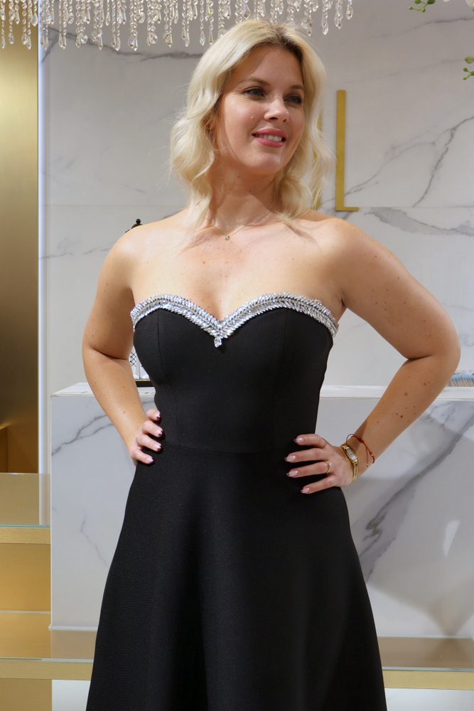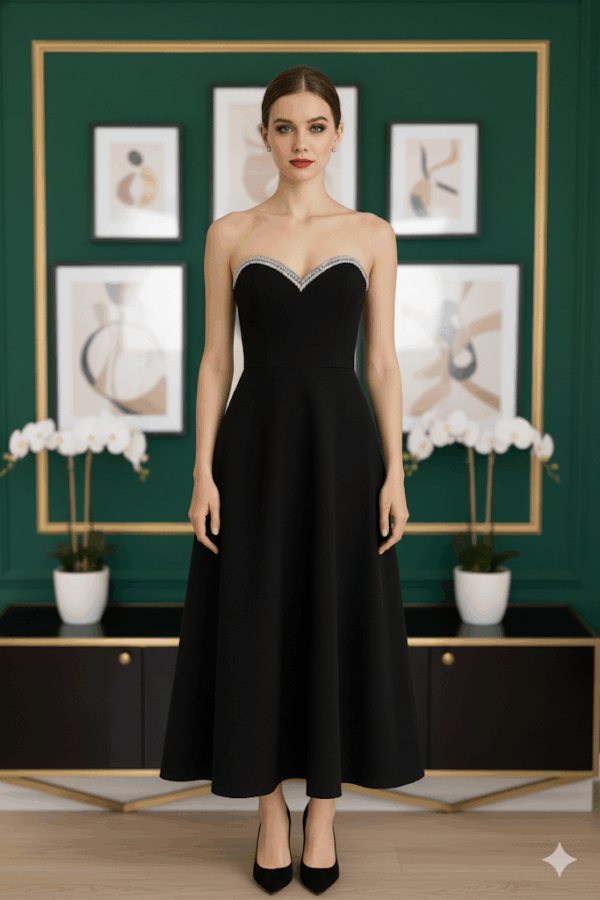 A pánt nélküli kialakítás finoman kiemeli a vállakat és a dekoltázst, míg az ezüst díszítés extra eleganciát és ragyogást ad az összhatásnak. A midi hossz visszafogott, mégis rendkívül nőies megjelenést kölcsönöz.