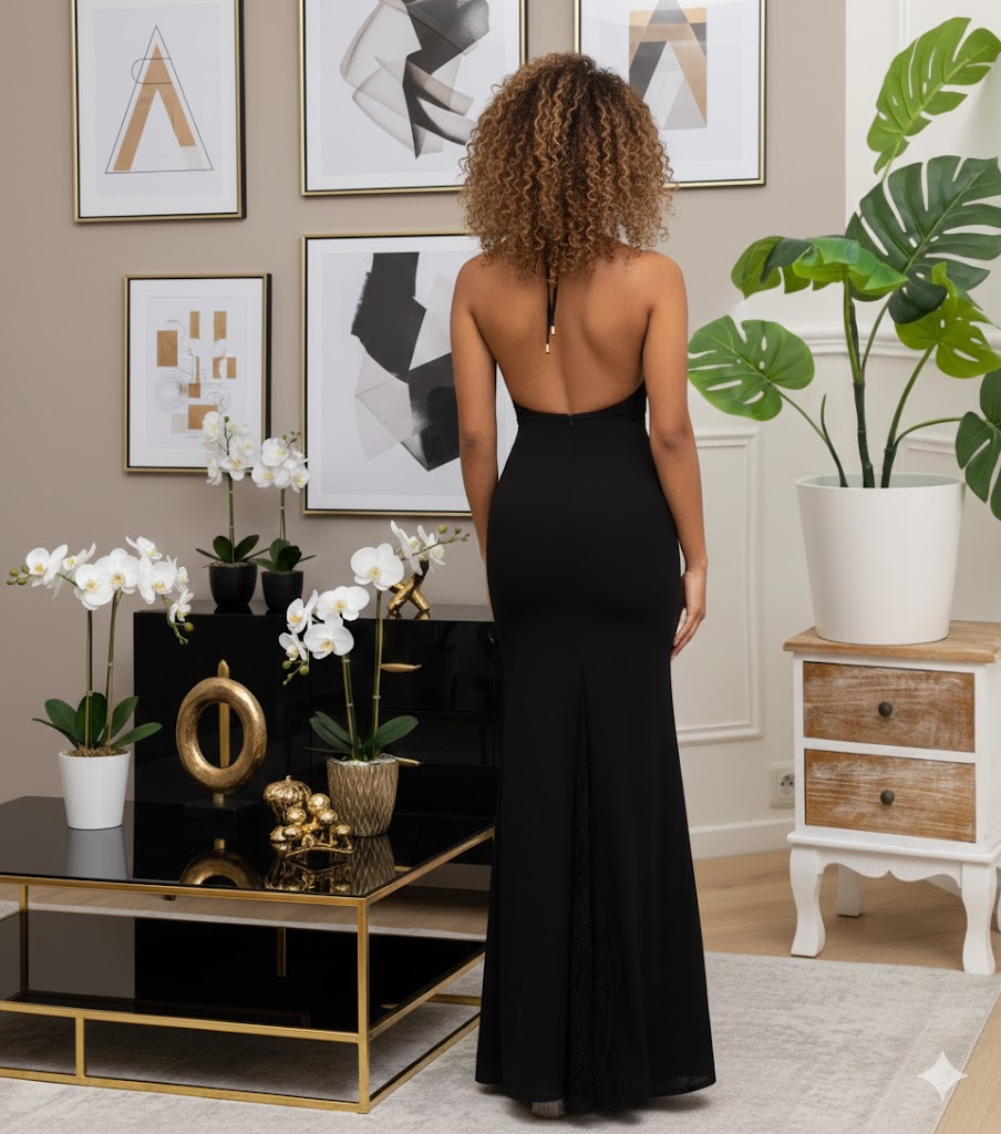 A Naya fekete csipke betétes maxi ruha a kifinomult nőiesség és a modern elegancia tökéletes kombinációja. A ruha V nyakú, nyakba kötős kialakítása különlegesen nőies vonalakat ad, miközben a nyitott hát még látványosabbá és elegánsabbá teszi a megjelenést.