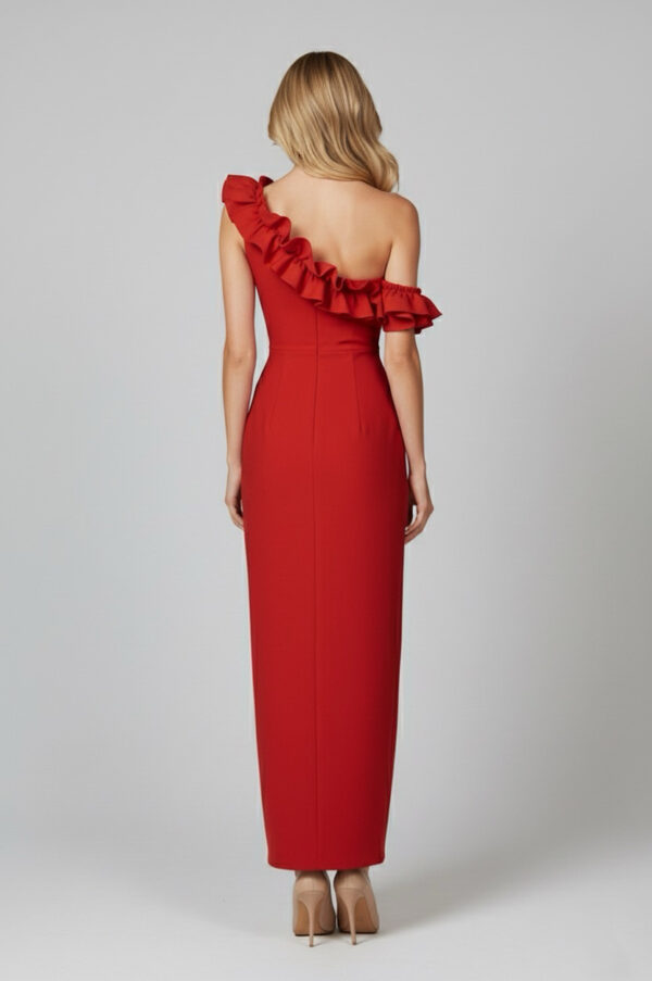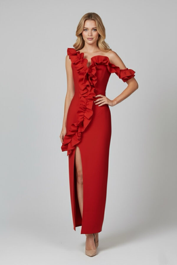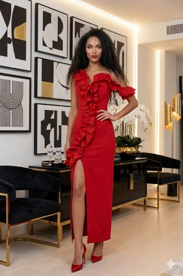 A félvállas, ejtett vállú kialakítás modern és trendi, szépen hangsúlyozza a vállakat és a nyakat. A fodros részletek romantikus, mégis feltűnő karaktert kölcsönöznek a ruhának. Ideális választás bálokra, esküvőkre, gálákra vagy bármilyen alkalomra, ahol szeretnél igazán emlékezetes és elegáns megjelenést.