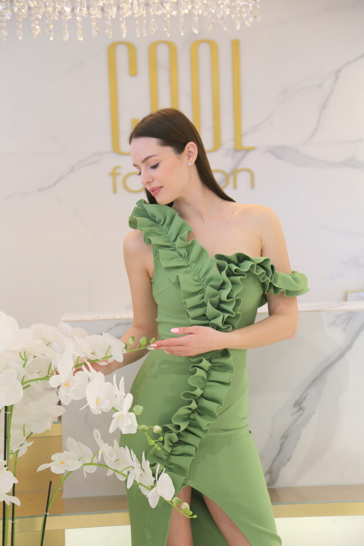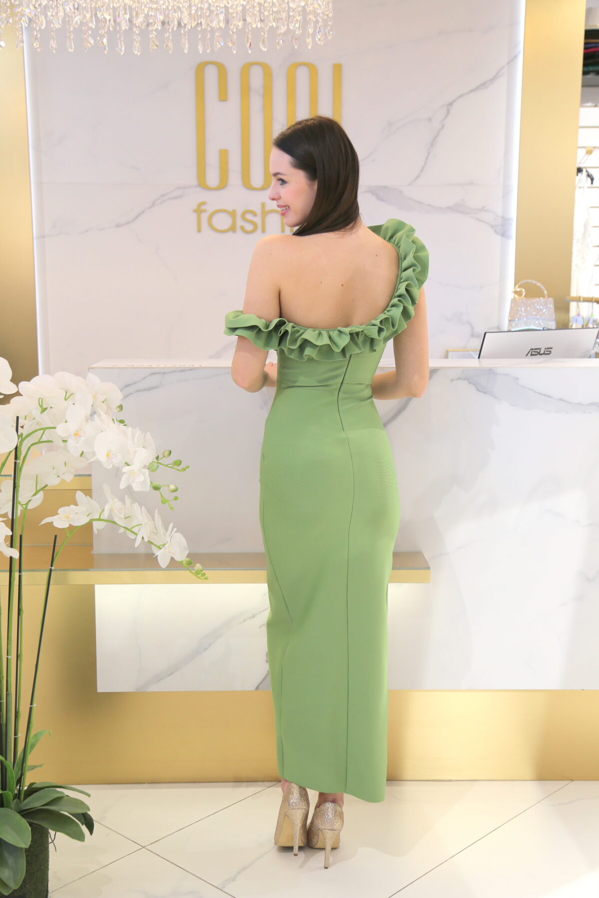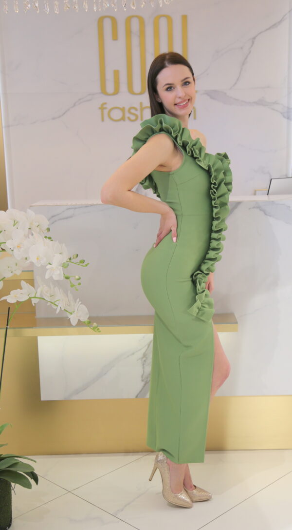 A félvállas, ejtett vállú kialakítás modern és trendi, szépen hangsúlyozza a vállakat és a nyakat. A fodros részletek romantikus, mégis feltűnő karaktert kölcsönöznek a ruhának. Ideális választás bálokra, esküvőkre, gálákra vagy bármilyen alkalomra, ahol szeretnél igazán emlékezetes és elegáns megjelenést.