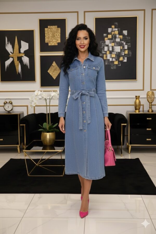 A Nerisa farmer midi ruha tökéletes választás, ha szereted a klasszikus farmerdarabokat nőies kivitelben. Galléros, gombos kialakítása ingruha hatást kelt, miközben az A-vonalú fazon finoman követi a test vonalát és kényelmes viseletet biztosít egész nap.