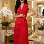A Neriva pliszírozott midi ruha tökéletes választás, ha elegáns, mégis modern megjelenésre vágysz. Az ujjatlan szabás és a galléros felsőrész harmonikus egyensúlyt teremt a klasszikus és a nőies stílus között. A pliszírozott szoknyarész minden lépésnél gyönyörűen mozog, könnyed és légies hatást keltve.