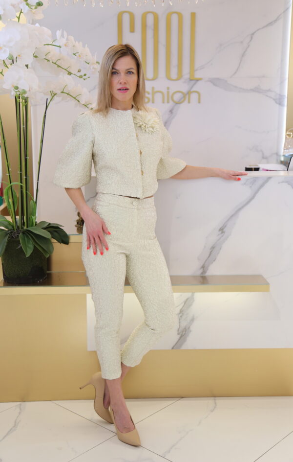 A Nika nadrág kosztüm szett azoknak készült, akik letisztult, mégis karakteres megjelenésre vágynak. A karcsúsított zakó hangsúlyozza az alakot, miközben a puffos ujjú kialakítás és a különleges, virág bross elegáns fókuszpontot teremtenek. A szatén bélés luxusérzetet ad, így a zakó nemcsak mutatós, hanem kényelmes viselet is.