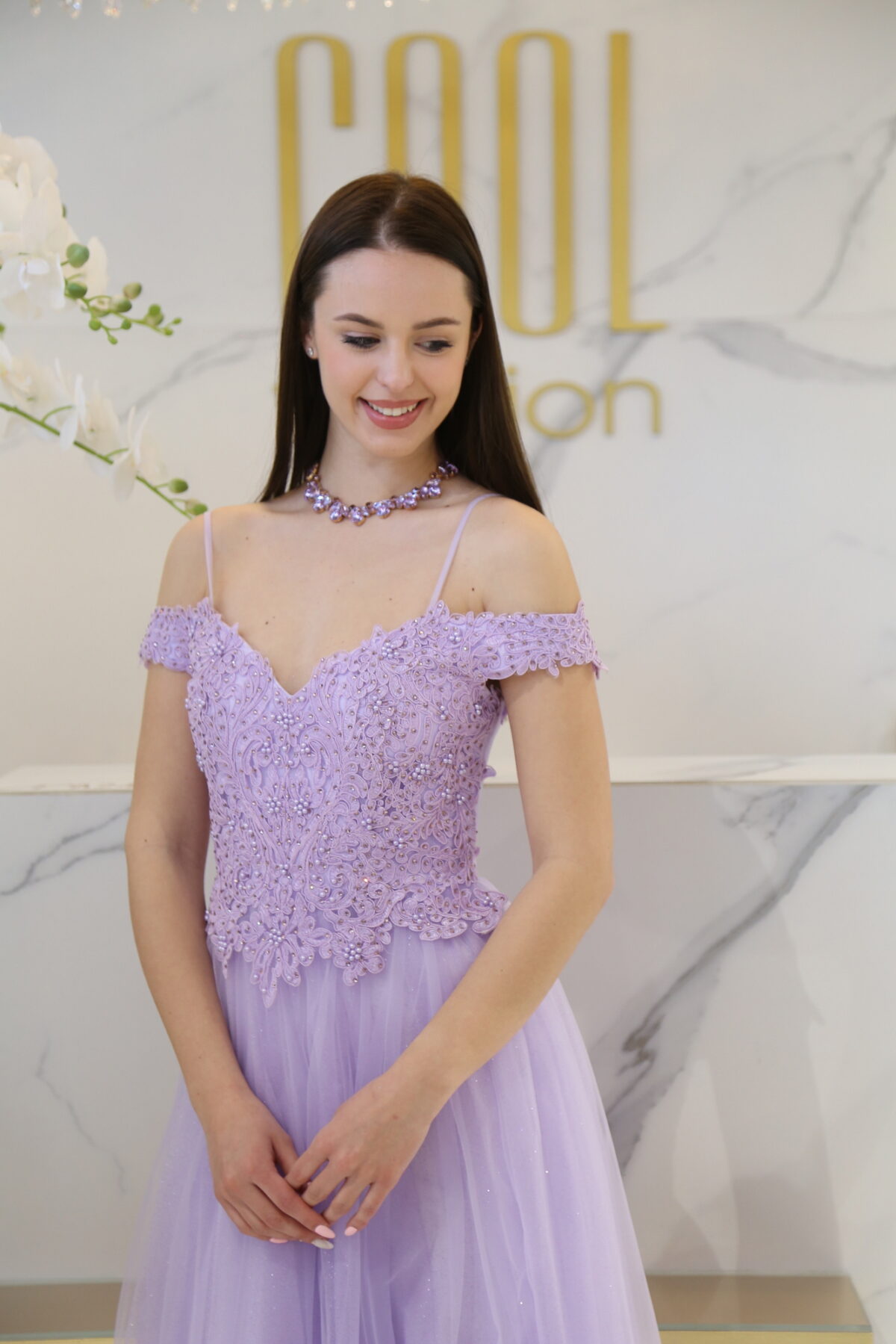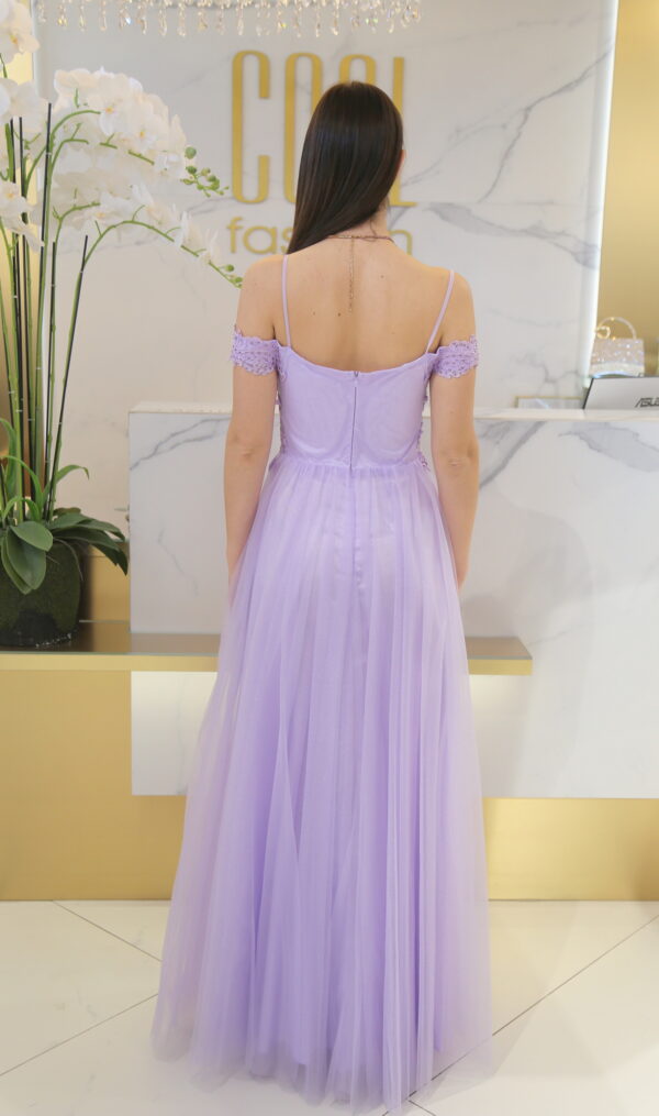A Noriva tüllös maxi ruha a kifinomult elegancia és a romantikus részletek tökéletes találkozása. Az ejtett vállú, spagetti pántos felsőrész csipkével és gyöngyökkel gazdagon díszített, amely azonnal magára vonzza a tekintetet, miközben nőiesen emeli ki a felsőtestet.