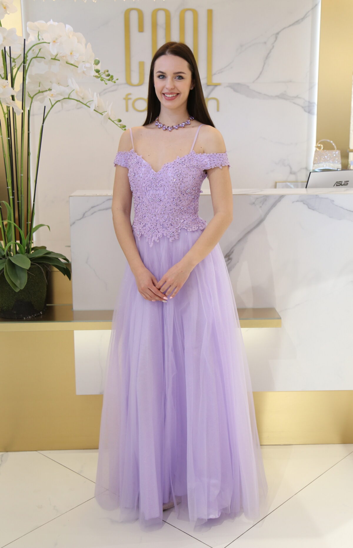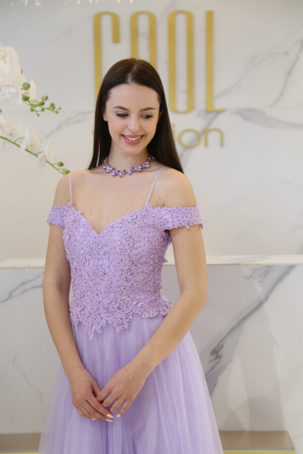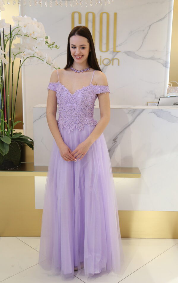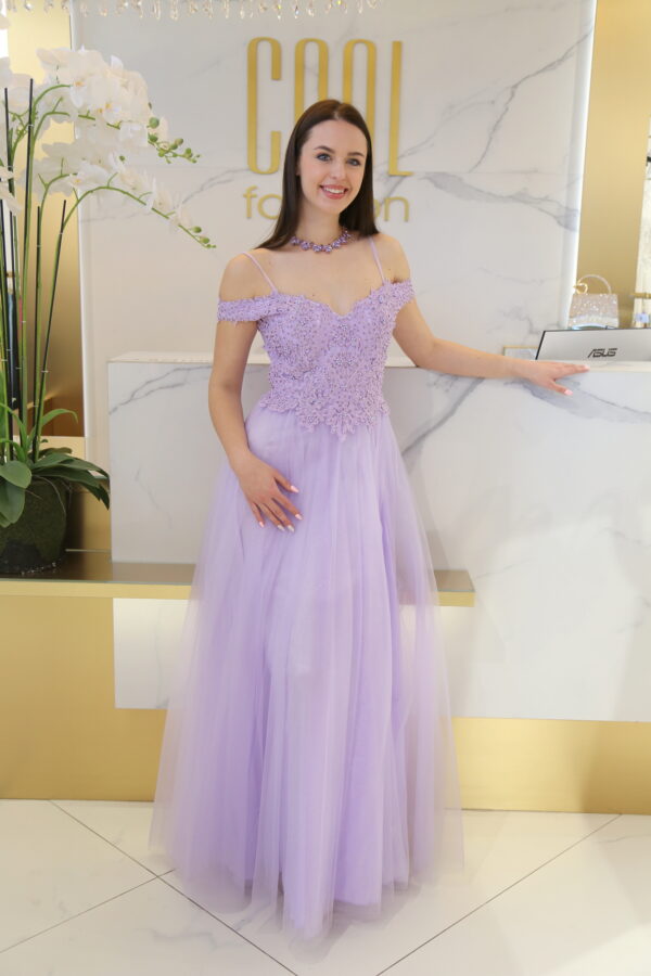 A tüllös szoknyarész légiesen omlik, az alsó csillogó réteg pedig minden mozdulatnál finom fényt ad a ruhának, így különösen látványos estélyeken, bálokon vagy elegáns eseményeken. A deréktól lefelé bővülő maxi fazon nyújtja az alakot, a hátul elhelyezett cipzár pedig praktikus és esztétikus megoldás.