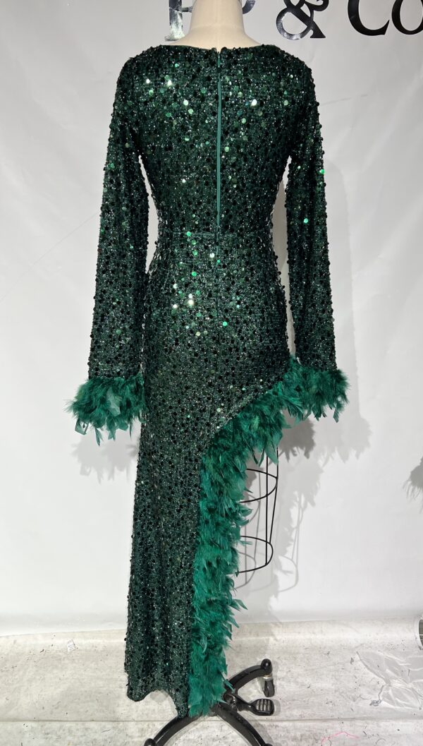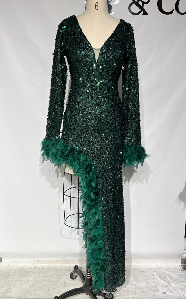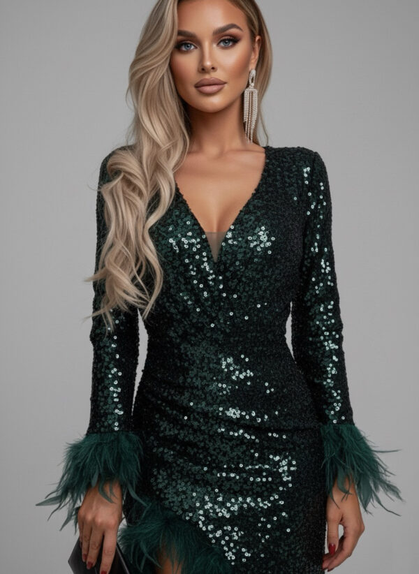 A derékban szabott kialakítás és a testhez álló maxi fazon gyönyörűen karcsúsítja a sziluettet, a hosszú ujj pedig eleganciát és kifinomultságot kölcsönöz. A mély V nyakkivágás nőies, látványos megjelenést biztosít, amely tökéletesen harmonizál a flitteres ragyogással.