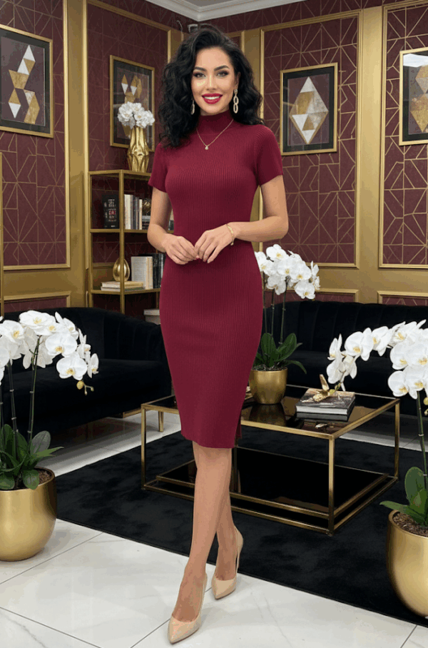 A Paloma kötött bordázott ruha stílusos, mégis kényelmes darab, amely bármilyen alkalomra tökéletes választás. A magasnyakú és rövid ujjú kialakítás elegáns megjelenést biztosít, miközben a bordázott kötött anyag gyönyörűen simul a test vonalaira.