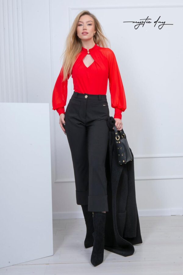 A Penelopé felső a kifinomult nőiesség és a modern elegancia tökéletes ötvözete. A szűk fazon gyönyörűen kiemeli az alakot, míg a hosszú, buggyos ujj extra eleganciát és divatos karaktert kölcsönöz a felsőnek. A magas nyakú kialakítás különösen előnyös, elegáns megjelenést teremt, amelyet izgalmasan ellensúlyoz a mellrészen található kivágás.