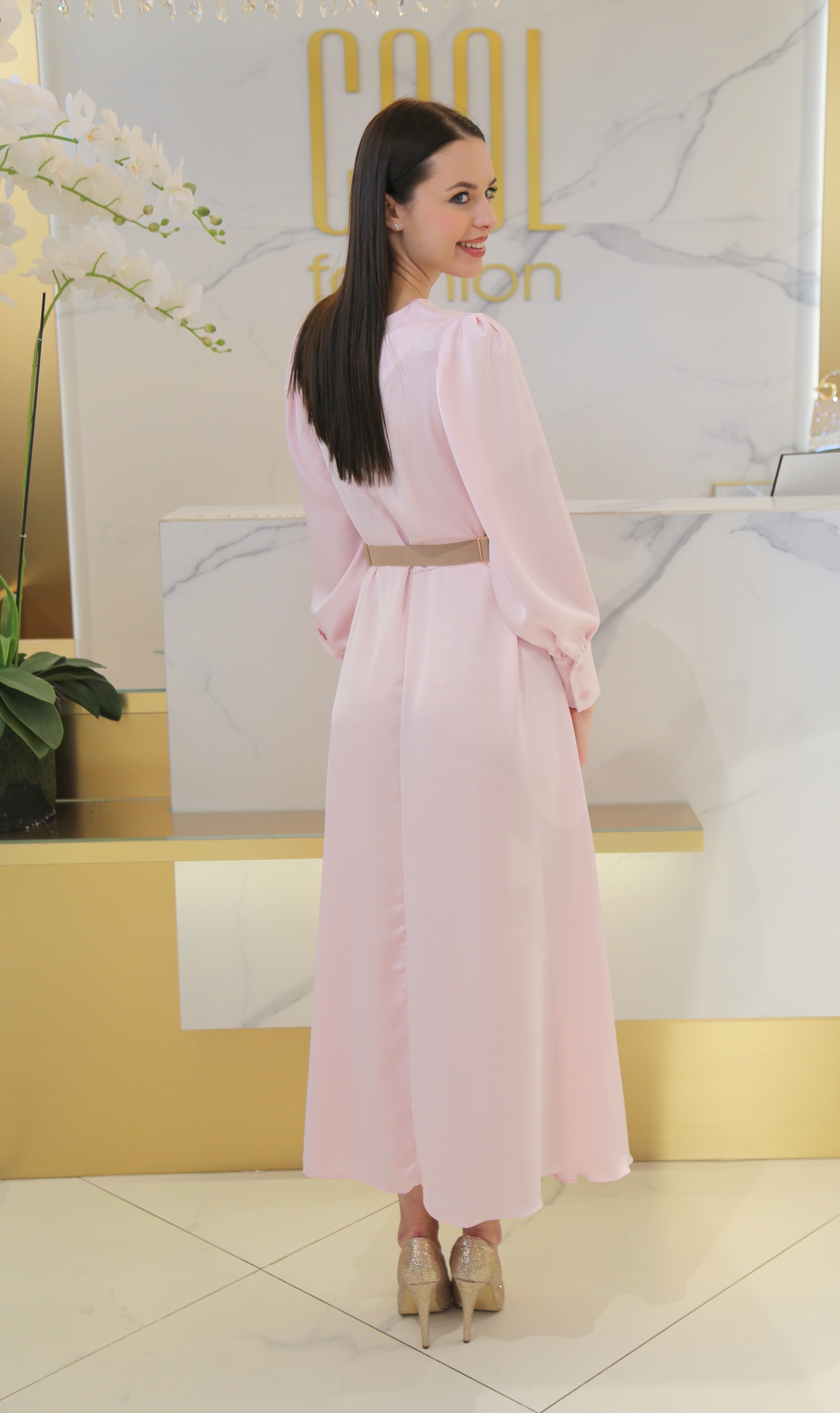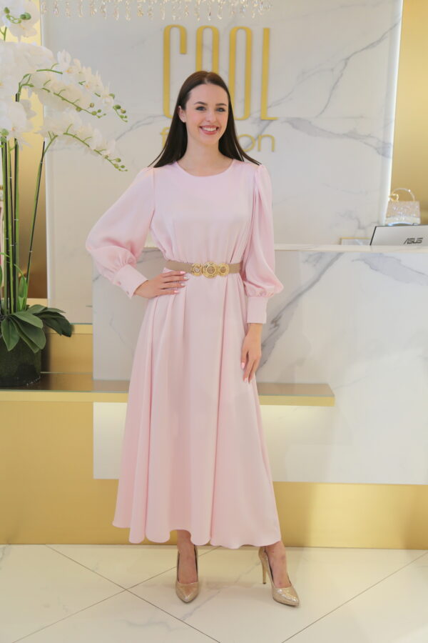 A hosszú, buggyos ujjak romantikus hatást keltenek, a derékban szabott fazon pedig szépen kiemeli az alakot. Az övbújtatós kialakításhoz tartozó vékony műbőr öv hangsúlyozza a derékvonalat, és tovább fokozza a ruha eleganciáját.