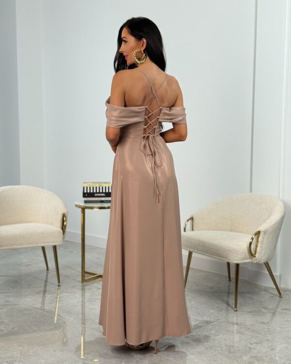 A Renata bronzarany csillogós maxi ruha a tökéletes választás minden olyan alkalomra, ahol fontos a magabiztos, ragyogó és elegáns megjelenés. A puha, fényesen csillogó anyag csodásan játszik a fényekkel, így a ruha már önmagában is ünnepi hatást kelt. A spagetti pántok és az ejtett vállak romantikus hangulatot adnak, miközben gyönyörűen keretezik a vállakat és a dekoltázst.