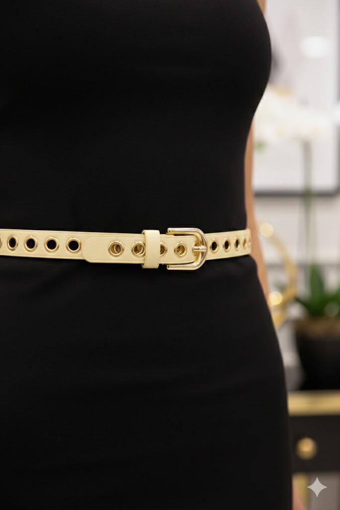 A arany ringlis öv elegáns és nőies kiegészítő, amely karikás dizájnjával és kapcsos záródásával minden szettet feldob.